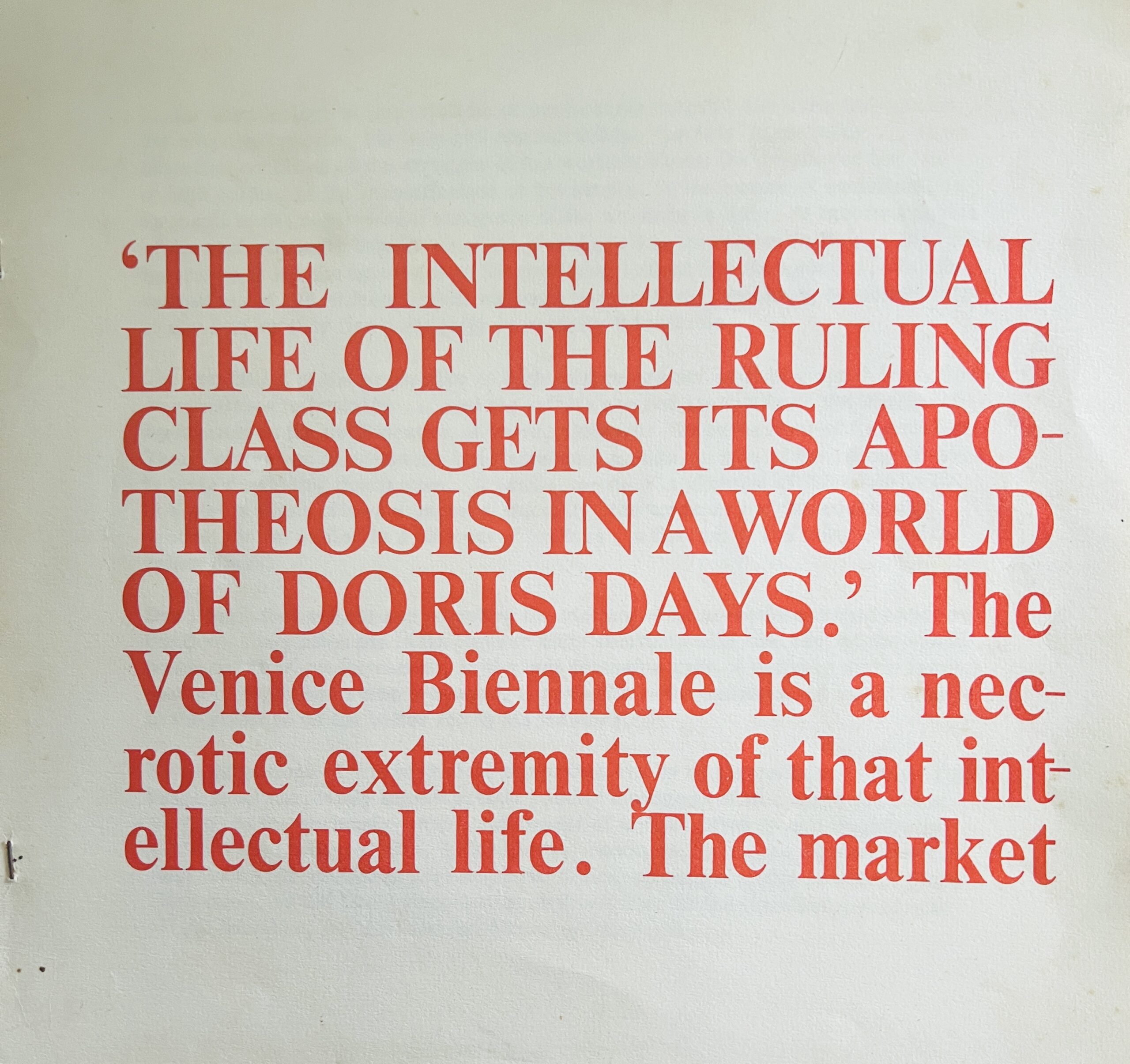 ‘THE INTELLECTUAL LIFE OF THE RULING CLASS GETS ITS APOTHEOSIS IN A WORLD OF DORIS DAYS". 1975.N.p. (Coventry): n.p. (Art-Language Press), n.d. (1975) 21 x 21cm, 8pp (self cover). Artist's book with a text by Michael Baldwin discussing the art market. Relatively unknown A&L publication. Minor browning at spine but overall VG+. JOINT (AS ISSUED): UNTITLED N.p. (Coventry): n.p. (Art-Language Press), n.d. (1975) 13 x 13cm, 1pp red and black offset lithograph with a minimalist design (presumably by Baldwin). VG+. -