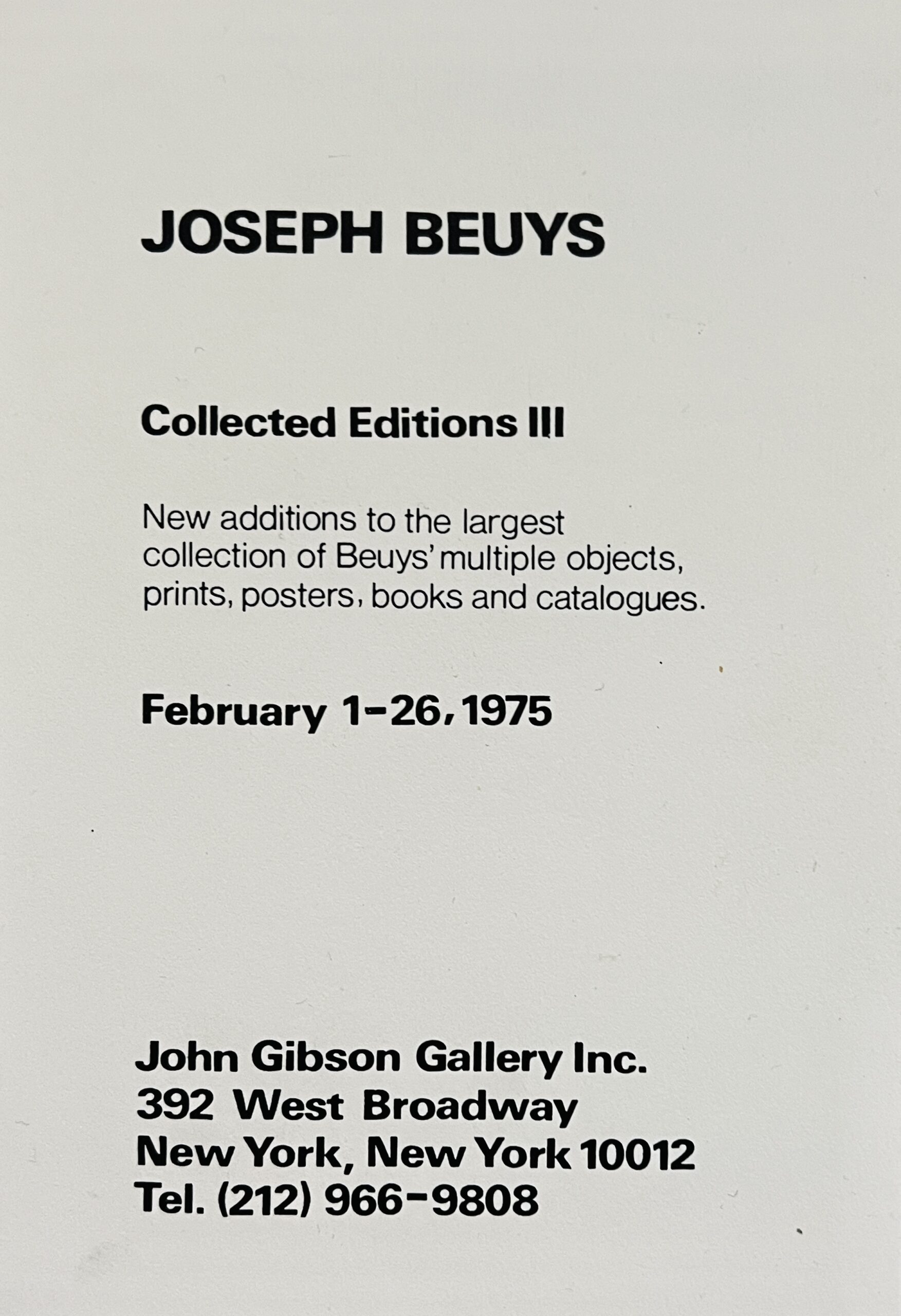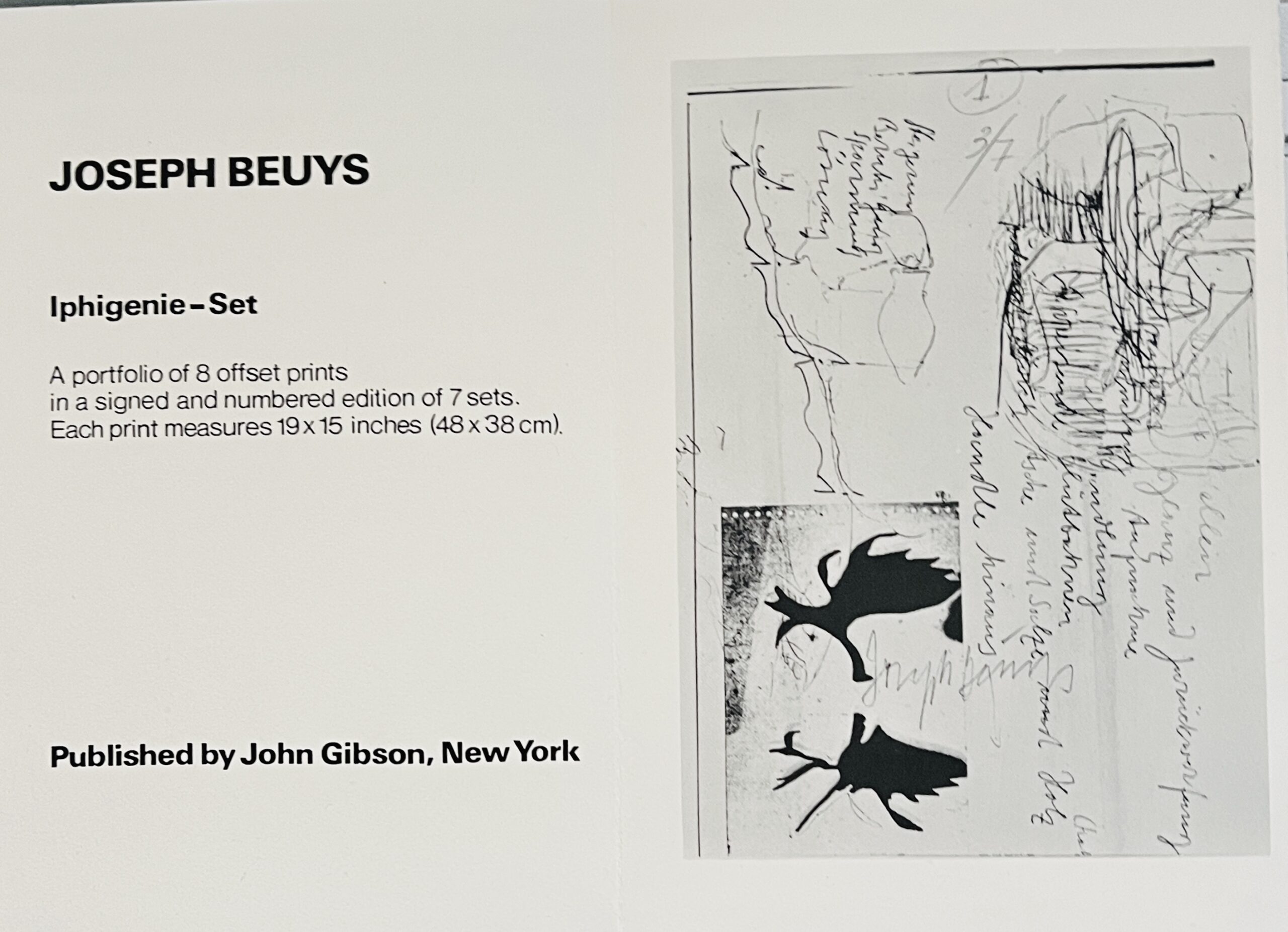 NYC: John Gibson Gallery, 1975 15 x 10.5cm, 10pp (single folded sheet) of a show of what was claimed as "new additions to the largest collection of Beuys' multiple object, prints, posters, books and catalogues". The card displays the full edition of Iphigenie-Set: 8 b/w images of prints. VG+. ...