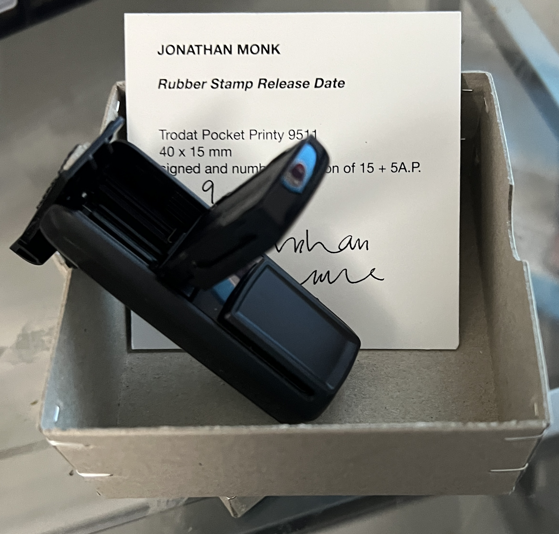 Brussels: MorePublishers, 2025 9.3 x 9.3 x 4.2cm, two part cardboard box content of a 7.5 x 2.5 x 2cm, "Trodat Pocket Printy" which is a self inking rubber stamp with a pre-set date which is the release date of the multiple (10 Dec 2025). The work references On Kawara's date paintings by noting the date of its own existance. One of only 15 examples (and 5 A/Ps) signed and numbered on a 8.5 x 8.5cm, 1pp certificate. VG+. Scarce. ...