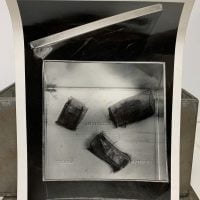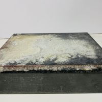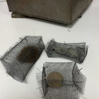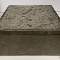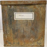18 x 24 x 24cm two part rusted (as issued) tin two biscuit box content of three home-made wide cages (chickenwire) containing the artist's hair, a ball of dirt (one of many such "boules" that Boltanski made almost compulsively during that time and a bloody elastoplast (the artist's blood). Additionally there is a signed photograph of the whole box. The bottom of the box has the text: " EMBALLAGE PERDU / PLOI STRICTMENT INTERDIT" which translates roughly to "LOST PACKAGING / STRICTLY PROHIBITED SHIPPING".