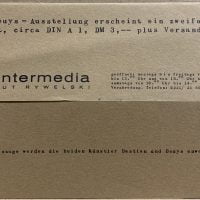 15 x 10.5cm, 1pp announcement card with a typographic design for a group show with Alvermann, Beuys, Spoerri, Uecker, Walther and Vostell. VG+.