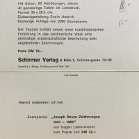 10.5 x 15cm, 2pp announcement card for a book and exhibition of Beuys drawings with an image of one such drawing by Beuys on the front, verso gallery details. Price of the book was 38 DM. one small pin hole on card else VG+.
