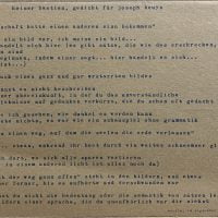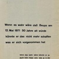 On the last page there is a text in German which translates to “If it were true that Beuys would turn 50 on May 12, 1971, he could no longer do what he set out to do / if that were true, he couldn't be a rabbit either, which is the case in reality -… said Beuys on December 18, 1970 on the Oberkasseler bridge”.