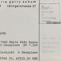 15 x 10.5cm, announcement card with a typographic design for a group show with works by Beuys, Boehmler, G. Brecht, S. Brouwn, Darboven, Dibbets, Filliou, Gosewitz, Graham, Koepcke, Knoebel, Lewitt, Manzoni, Panamarenko, Palermo, Polke, G. Richter, Rot, Ruthenbeck, Vautier, Vostell et al. VG+.