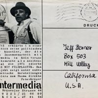 16 x 23cm, printed envelope with an image of Beuys and a text about the edition Tragetasche mit Filzplastik. This envelope is hand addressed to the Fluxus artist Jeff Berner. Slight wear from the postal experience else VG.