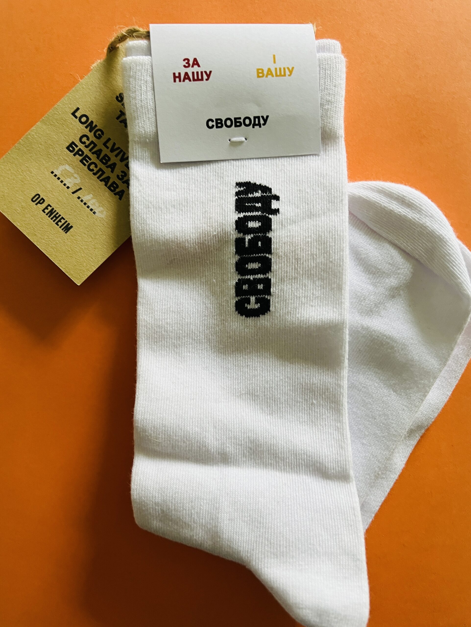 Medium sized (42 – 46) white cotton socks with and embroidered text “СВОБОДУ” – Russian for Freedom. An appeal to support Ukraine which has been attacked by the totalitarian Putin regime. Limitation not known. Unworn with original cardboard tags.