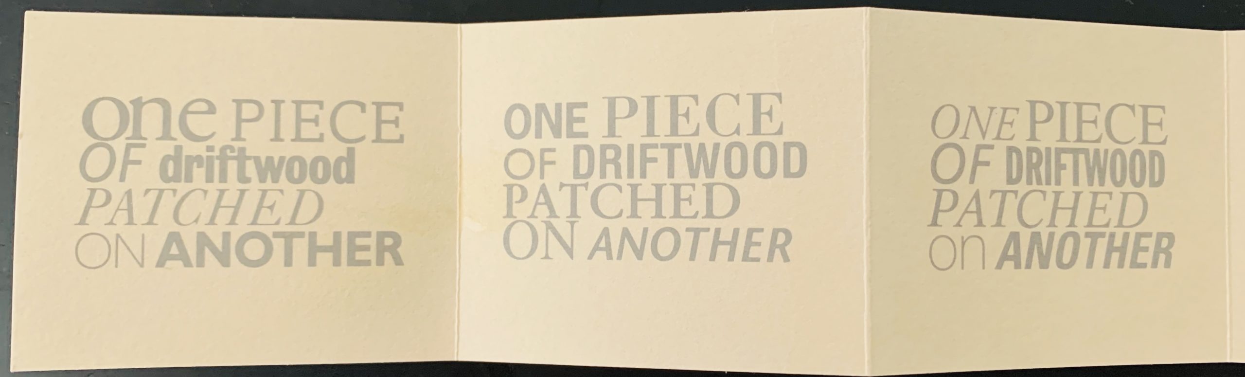 6 x 12cm, 6pp concertina folded card. A text “one piece of driftwood patched on another” is repeated on three of the panels – but the typography of each is different with various fonts used to emphasis different aspects of the conjured images. The different fonts also reflect the text in that each is “patched” upon another in an unusual way that still creates a harmonious whole. VG+.