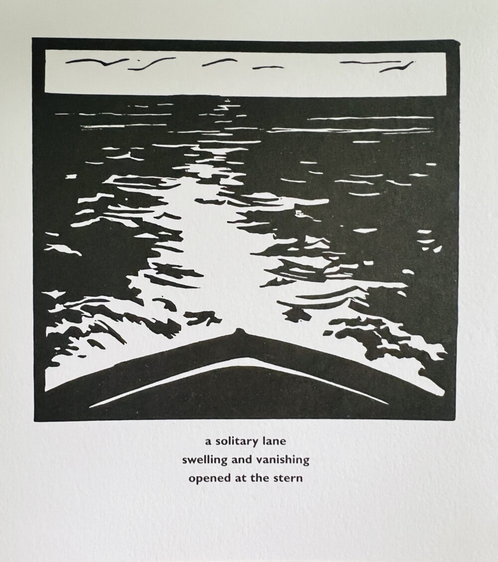16 x 14.4cm, 4pp card printed black on white with a linocut by Jo Hincks of a stern of a ship and its wake. A text below by Finlay notes: a solitary laner swelling and vanishing opened at the stern Comparing the wake with a country lane winding behind (or in front ) of you. VG+.