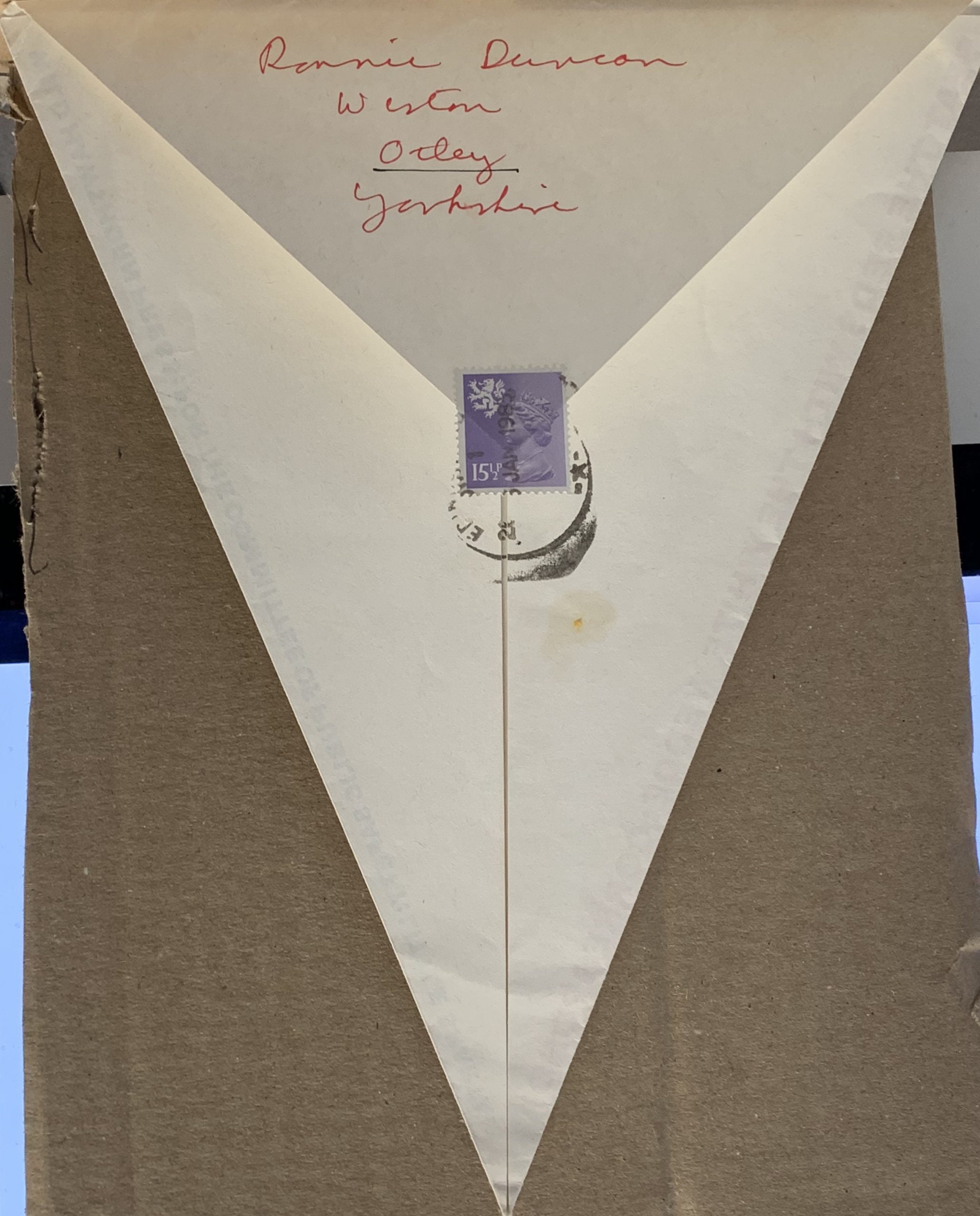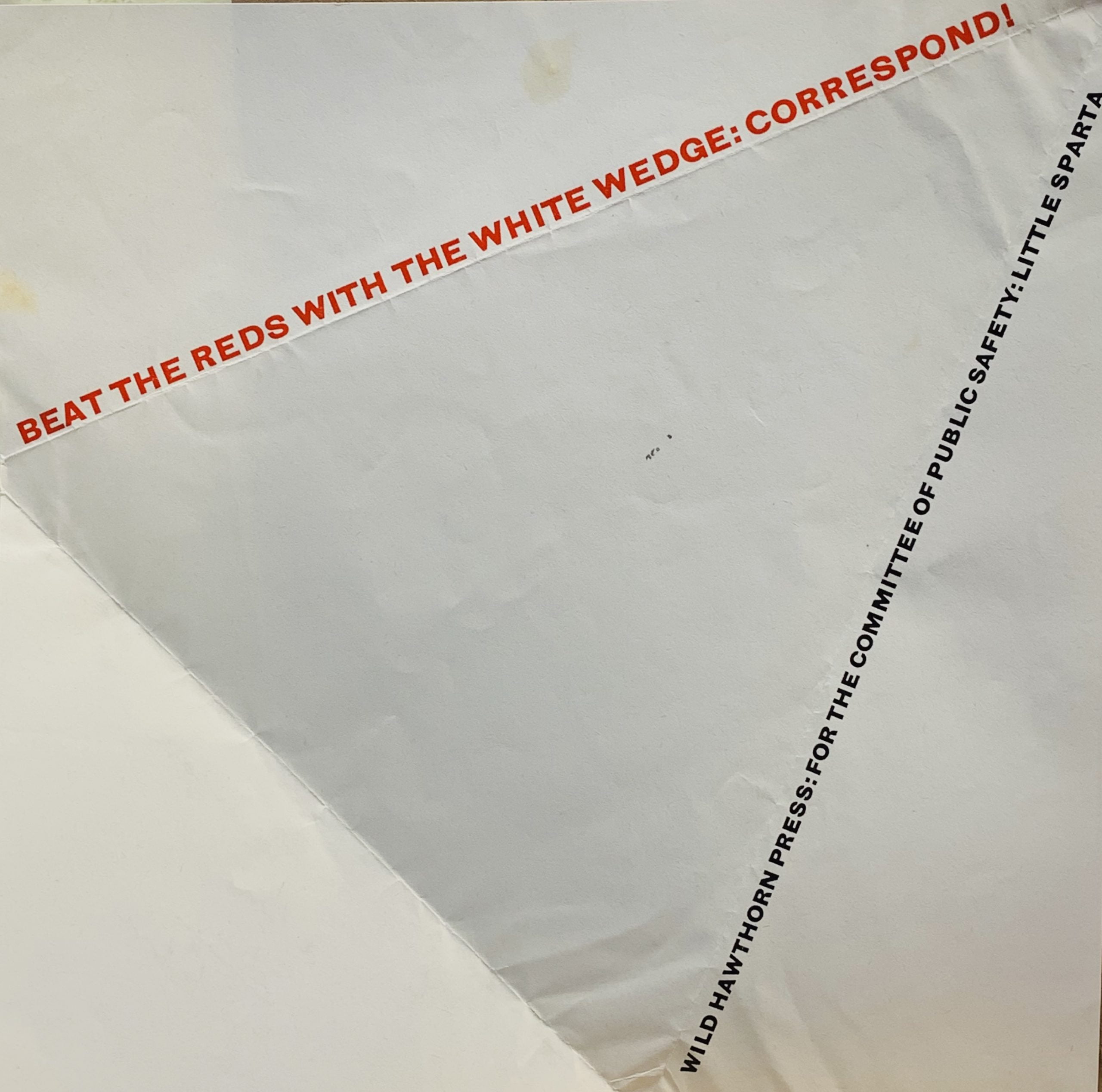 The text inside: “BEAT THE REDS WITH THE WHITE WEDGE: CORRESPOND!” adapts the Russian revolutionary slogan from the famous painting by Lazar Markovich Lissitzky, suggesting writing letters may be a radical response to the attacks on Little Sparta by the Strathclyde Region. It should be noted that the dart is supposedly published by the “Committee of Public Safety” which was the centralised mechanism by which Robespierre and Saint-Just controlled the Terror of the French revolution. This is a mailed example to Ronnie Duncan with stamp and frank. Murray lists this as a card – which is debatable we have decided to categorise it as a letter/document because of it’s intent as a campaigning item. VG+.