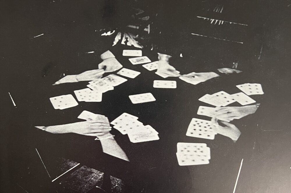 10.5 x 15cm, 2pp announcement card for a solo show with an frame from the film “Cardplayers” from 1976 on the front in b/w, verso gallery details. Unmailed example – VG+.