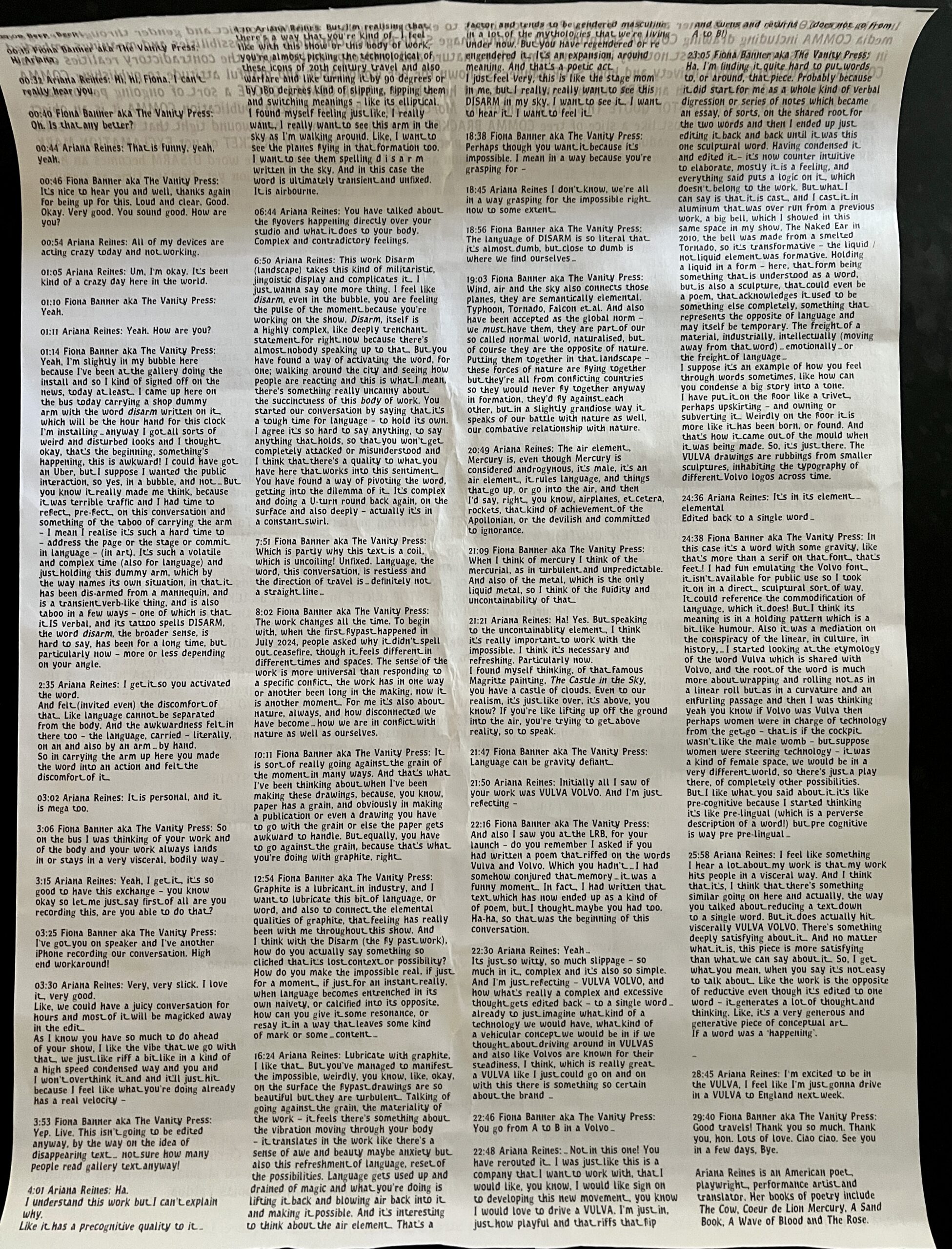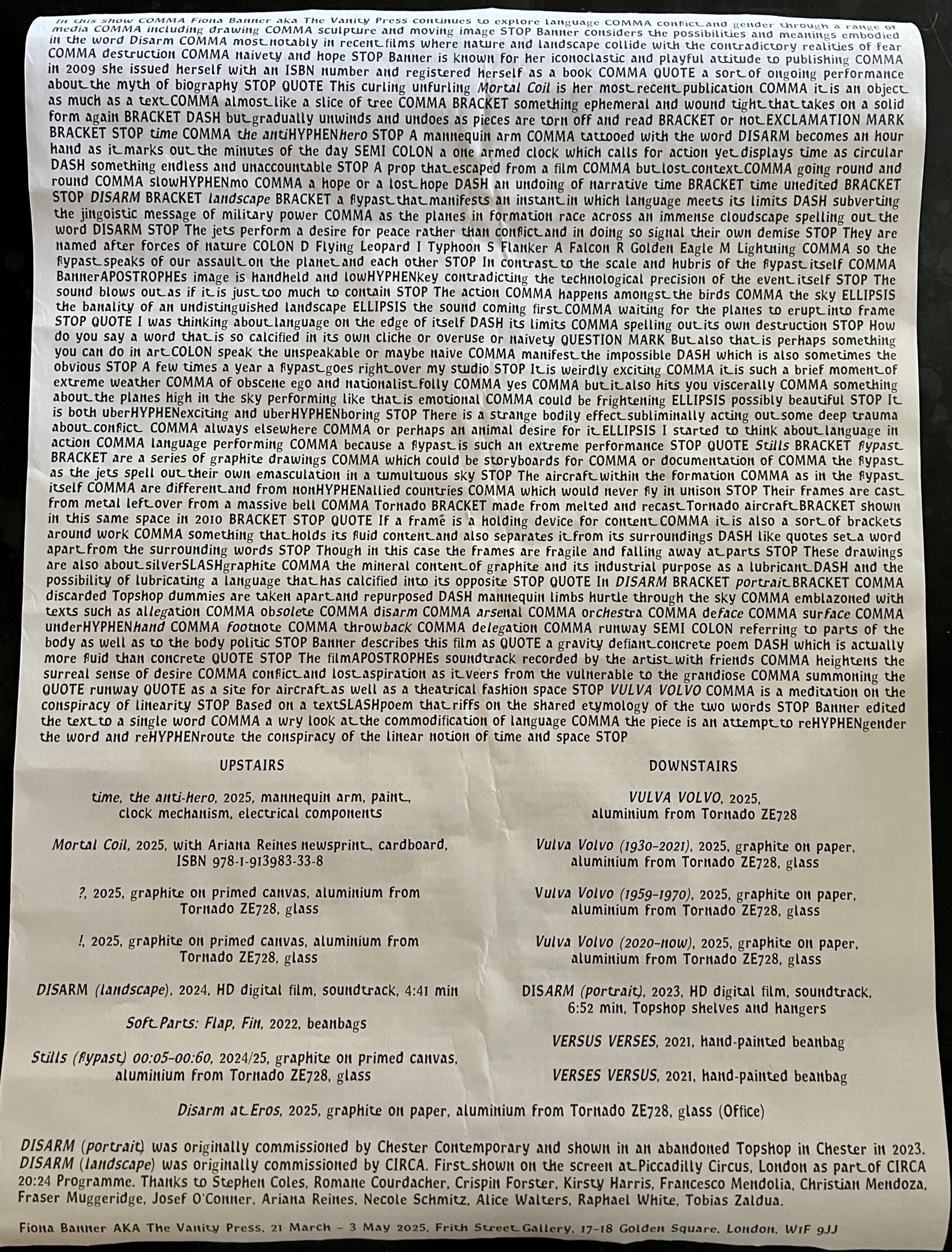 75 x 54cm (approx), 2pp sheet of newsprint paper with a typographic design and a dense text on both sides by Banner printed in her own typeface (“Banner’s Font”). Exhibition catalogue for a solo show with the unusual format of being a section of a huge uncut sheet which was displayed in the middle of the gallery with a repeated text which attendees where allowed to tear off and take home. This is a complete sheet with all of the text retained and the edges f the sheet have been cut relatively smoothly with scissors. Scarce complete and in such condition. VG+ although showing some unavoidable soft handling creases.
