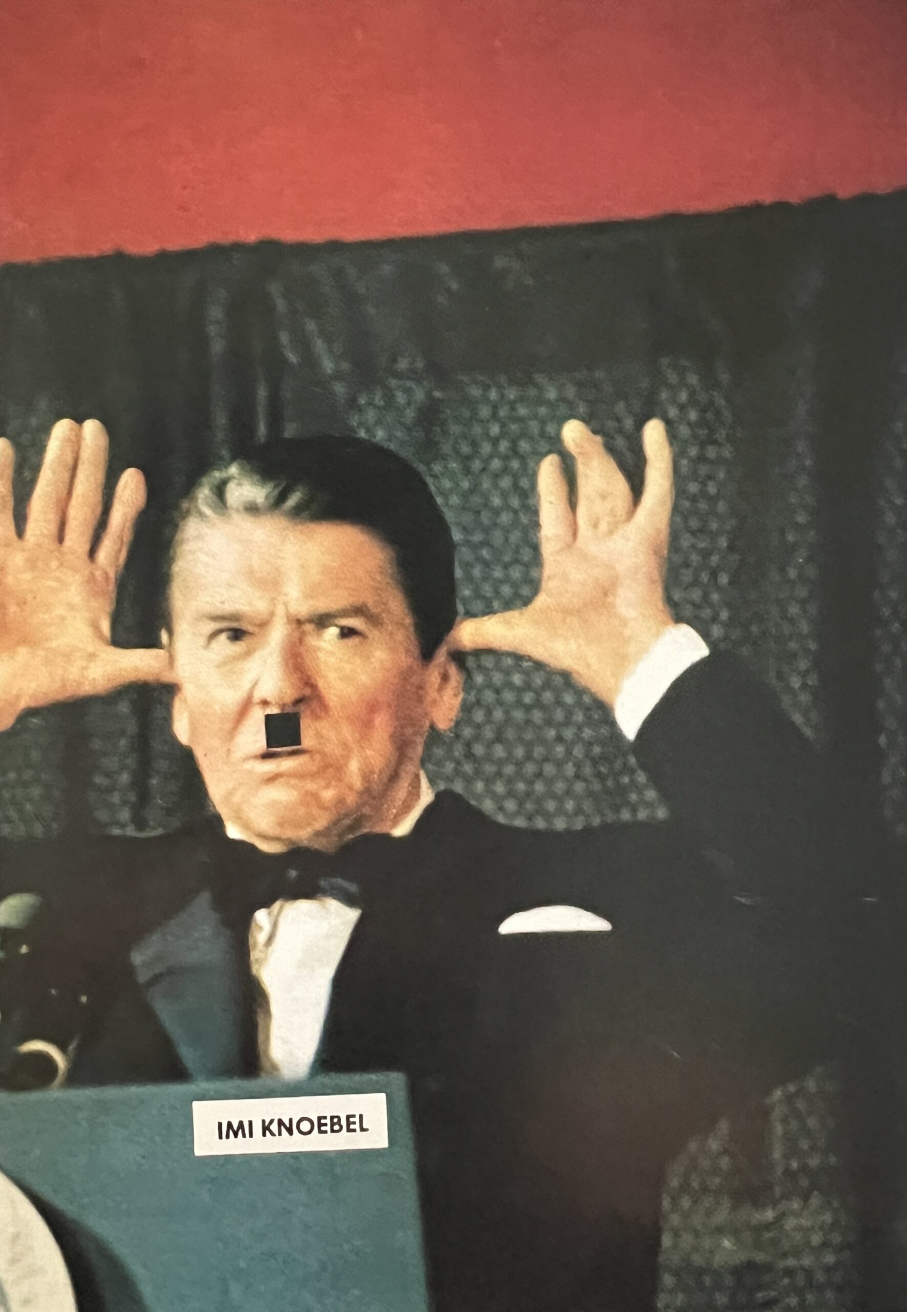 15 x 10.5cm, 2pp artist designed potscard with a photocollage on the front morphing Ronald Reagan into Hitler by the addition of a moustache. Verso gallery details and postcard design. VG+>