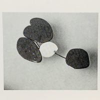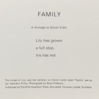 On the back of the card is a photograph by Dave Paterson of a small wooden sculpture by Finlay called “Lily” and the poem is an adaption of a Cutt’s poem FAMILY which we believe to be about the latter’s children but cannot confirm. Finlay’s mild parody references the photograph where an additional floating “leaf” appears to have been attached to the sculpture by wire – almost as if it has grown -the shape of the leaf, is like the round full stop. VG+.