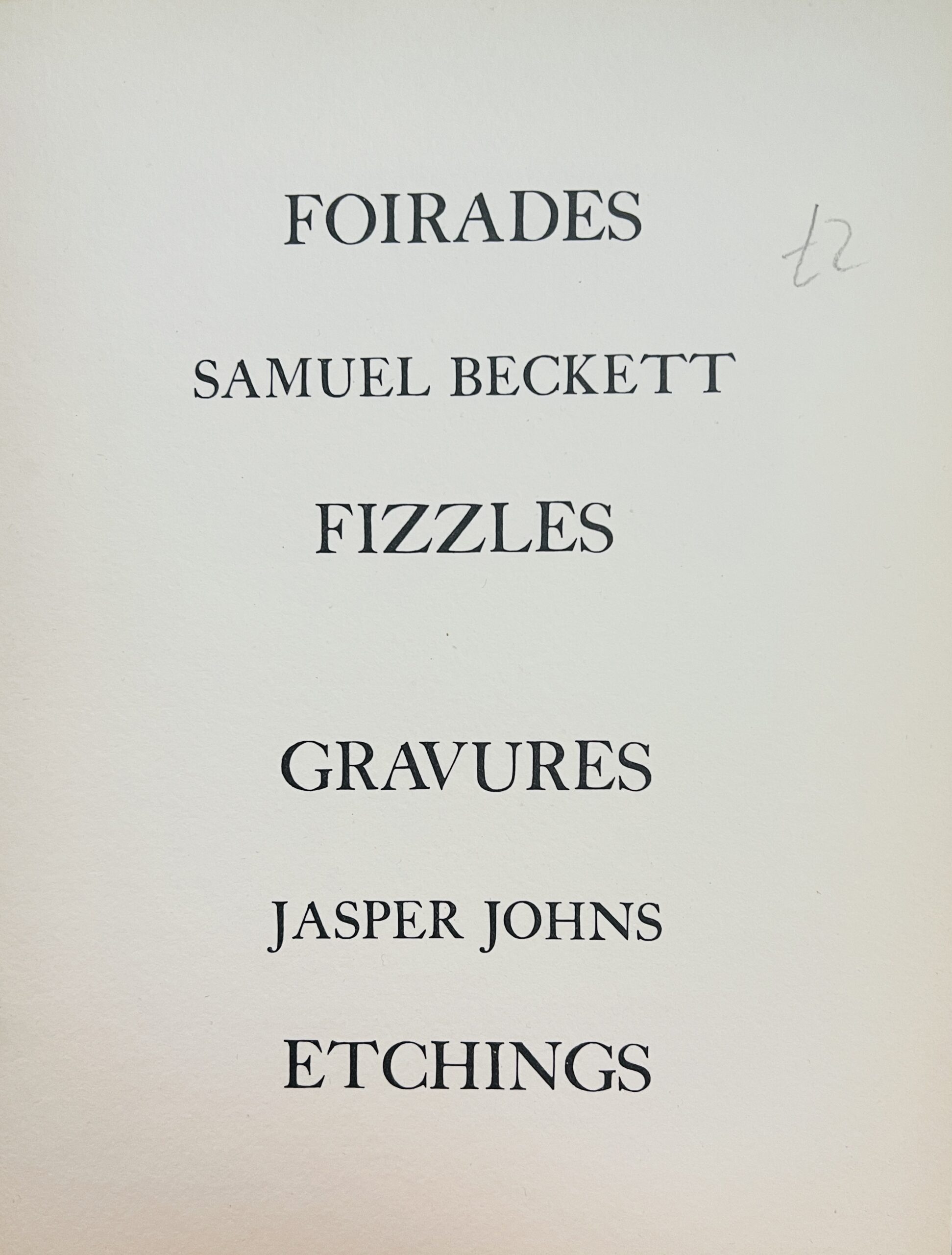 21 x 15cm, 8pp brochure to promote the release of the artist’s book between Samual Becket (with five new texts) and thirty-three Jasper Johns etchings. One of the short texts is repriduced in full in french and English and there are 3 reproductions from John’s etchings. VG+.