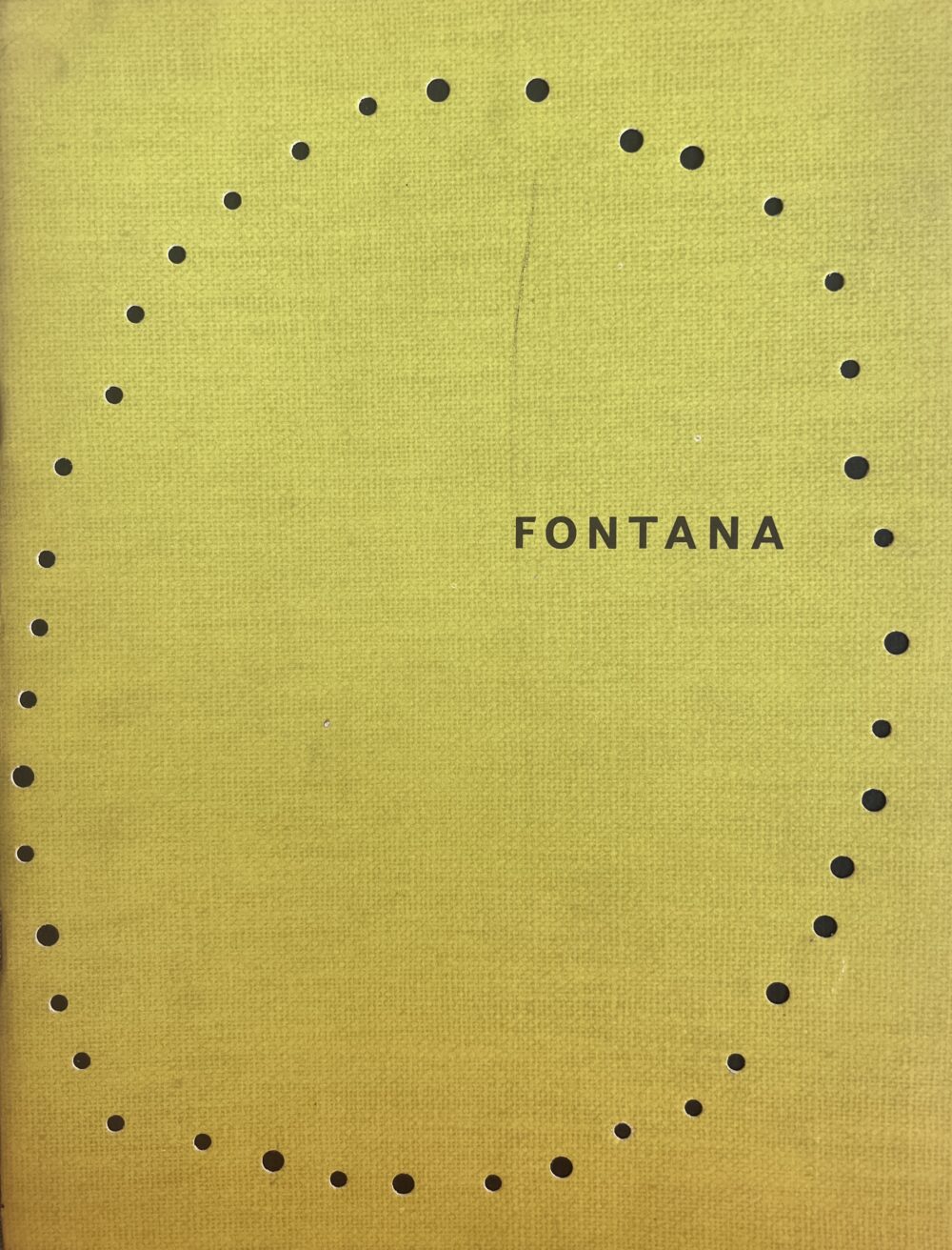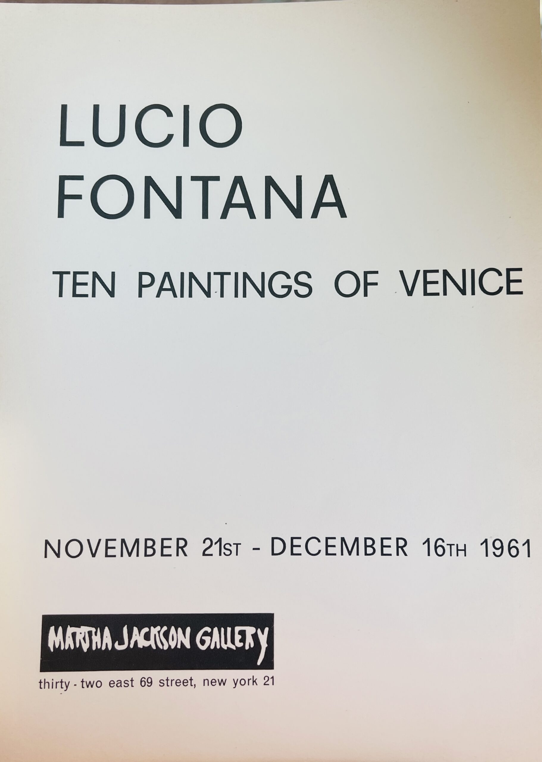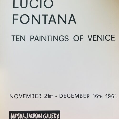 28 x 22cm, 20pp plus Fontana designed wrappers with die cut holes on yellow. Internally 10 reproductions of works – 5 of which are in colour and tipped in. Essay in English. Release on the occasion of TEN PAINTINGS OF VENICE after his Venice exhibition of 1961.