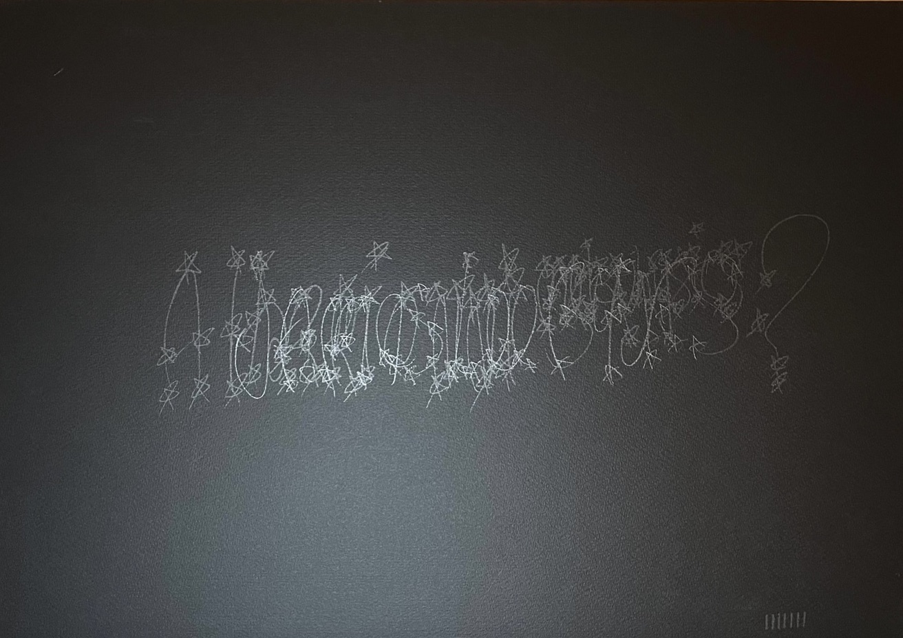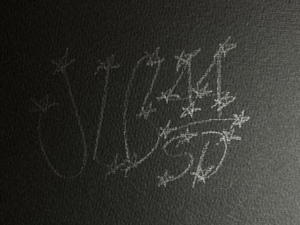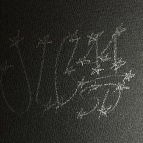 34.8 x 50cm silkscreen, silver on black wove paper. One of 10 serigraphs issued jointly by Byars and Beuys – each creating five each based on typographic drawings by each artist. This was number 7 (IIIIIII) from the portfolio with a reproduced drawing by Byars in his recognisable starry lettering. This was one of 50 signed and numbered prints alongside ten artist’s proofs. VG+. Scarce.