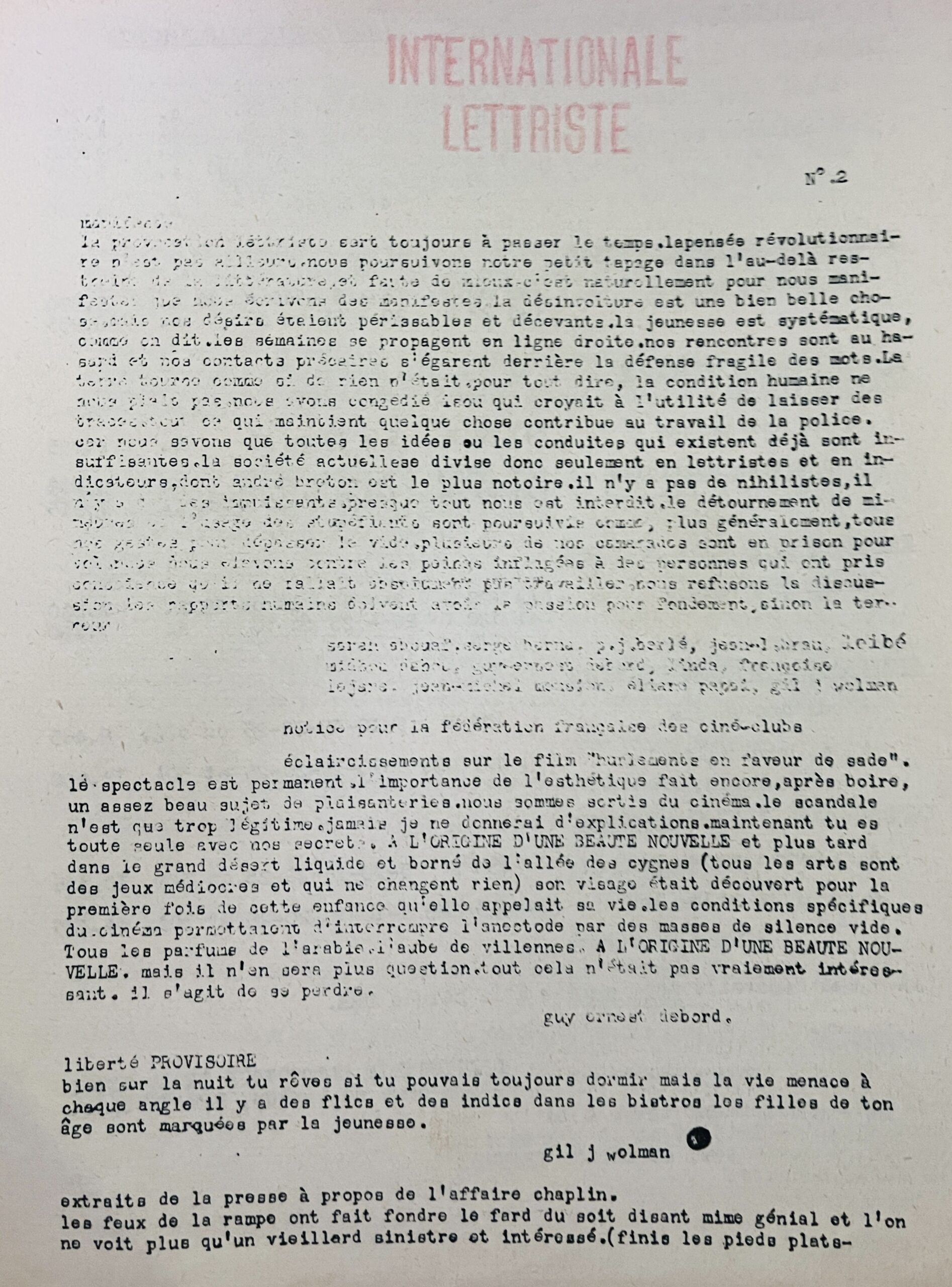 27 x 21cm, two sheets 2pp and 1pp respectfully. The second issue of the Lettrist International, published in February 1953, at thet time when the group had left Isou’s main grouping and had added a number of new adherents such as Sarah Abouaf, Serge Berna, P. J. Berlé, J.-L. Brau, Leibé Midou Dahou, Guy-Ernest Debord, Linda, Françoise Lejare, Jean-Michel Mension, Eliane Papaï, and Gil J. Wolman all of whom signed the manifesto published herein. The publications also has texts by Debord, Wolman, and Jean-Michel Mension, and press cuttings concerning the contentious “Chaplin affair”.