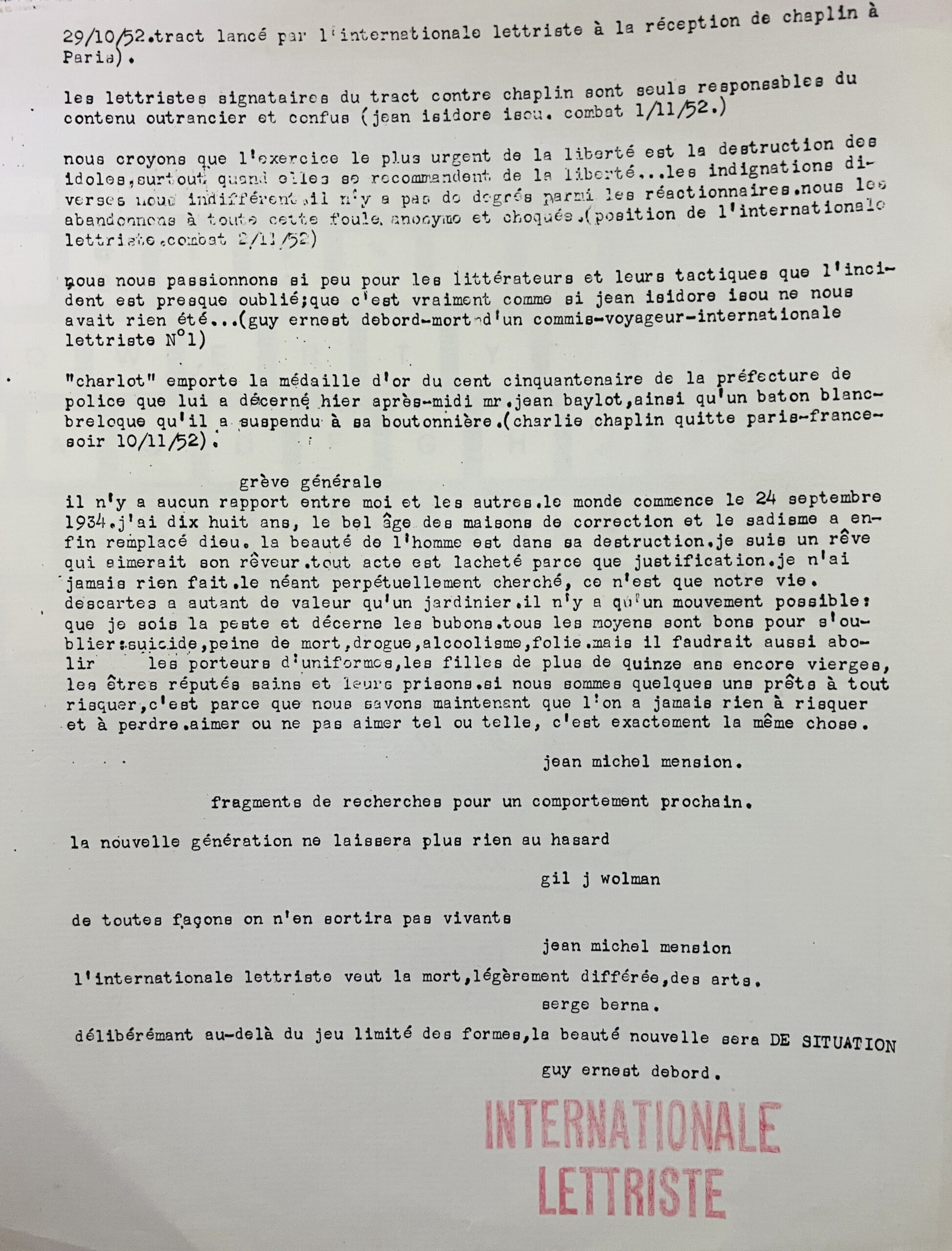 Both sheets have a red stamp of the Lettrist International . This publication is usually found as a single sheet but here we include the far rarer second sheet with an extract of the public response of the International Letteristes to Chaplain’s visit and their opposition to it and Isou’s support.