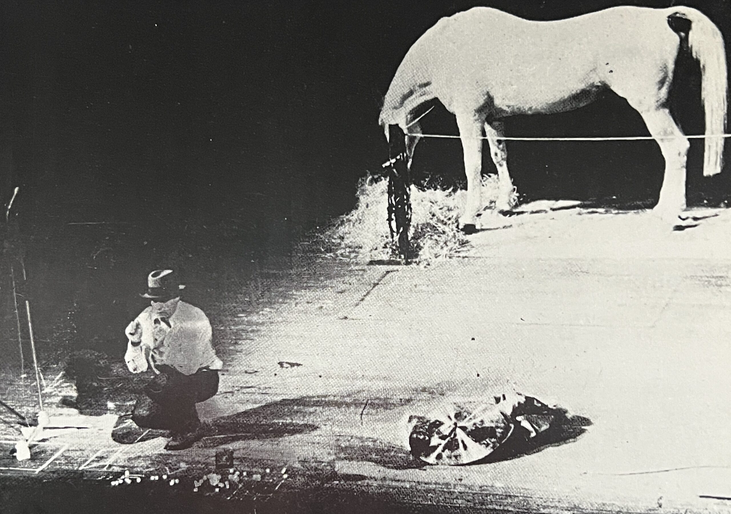 10.5 x 15cm 2pp. Announcement card for a posthumous show which took place only 9 months after the artist’s sudden death. Image on the front of a Beuys performing Titus Andronicus/Iphigenie aktion (with a live horse) in 1969. A unmailed copy -VG+.