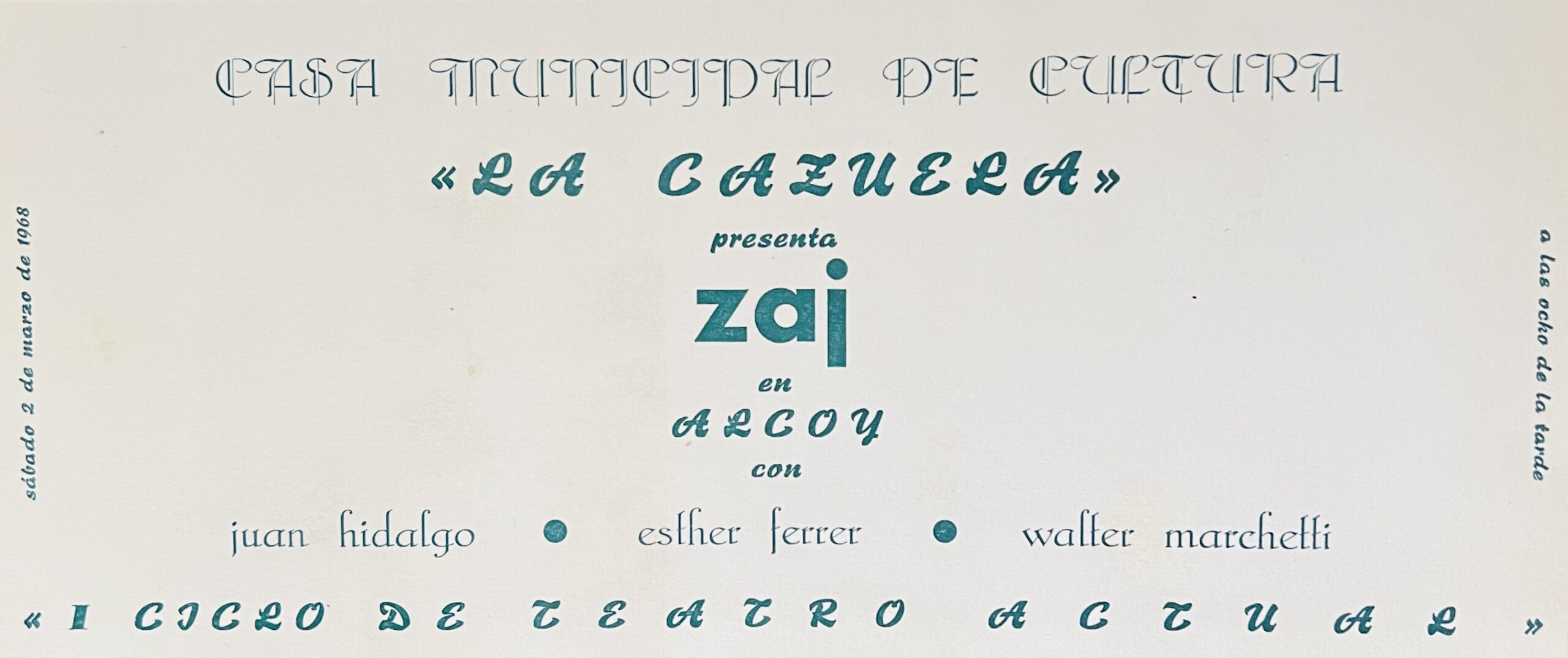 LA CAZUELA PRESENTA ZAJ EN ALCOY WITH JUAN HIDALGO, ETHER FERRER, WALTER MARCHETTI. 1968. WITH HAND ADDRESSED PRINTED ENVELOPE TO DAVID TUDOR.