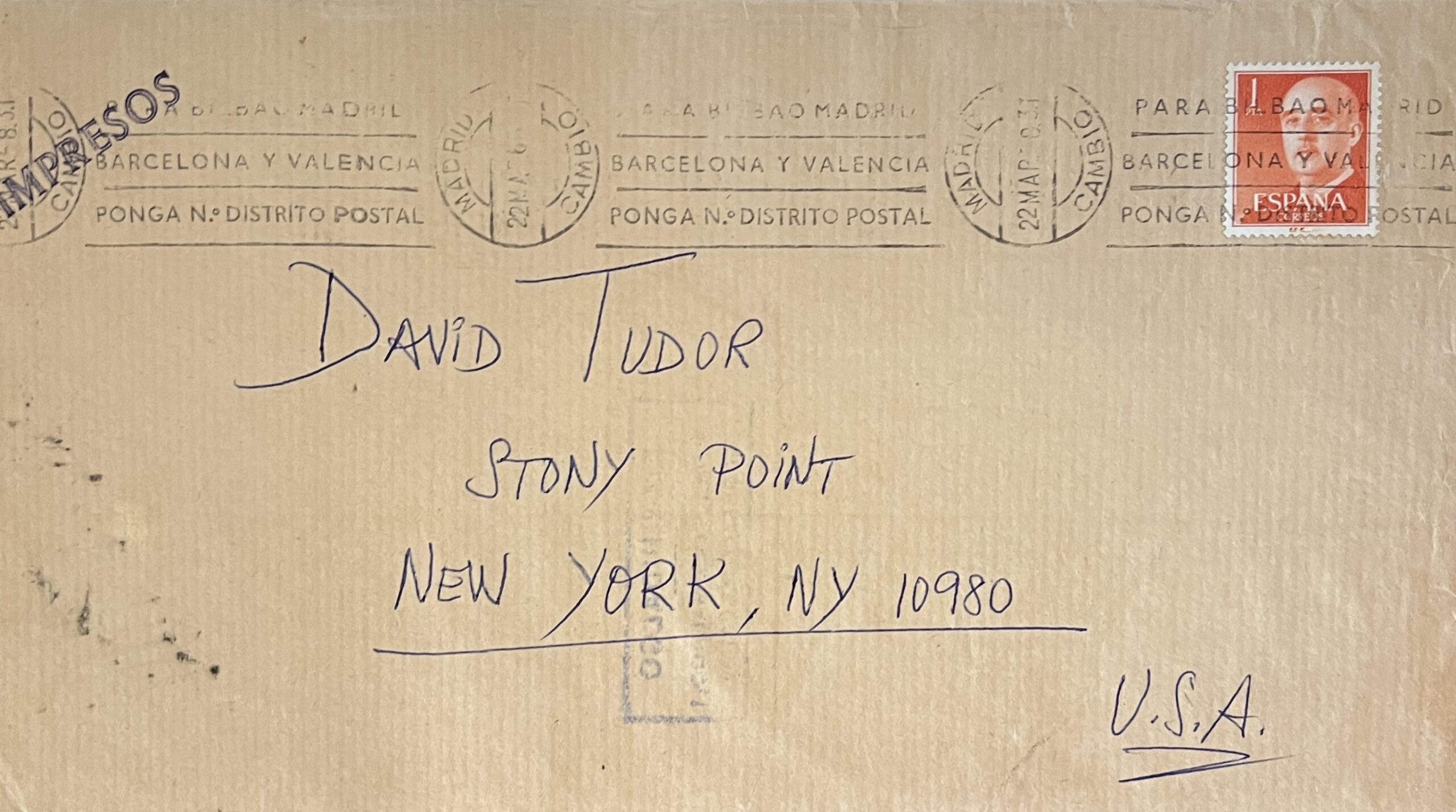 Original 14.2 x 25.8cm manilla envelope over rubber stamped by Hidalgo on the back with his address and “Impressos” on the front. The envelope is had addressed in ink to the musician and Fluxus artist David Tudor probably by Hidalgo. Stamped and franked but neatly opened.