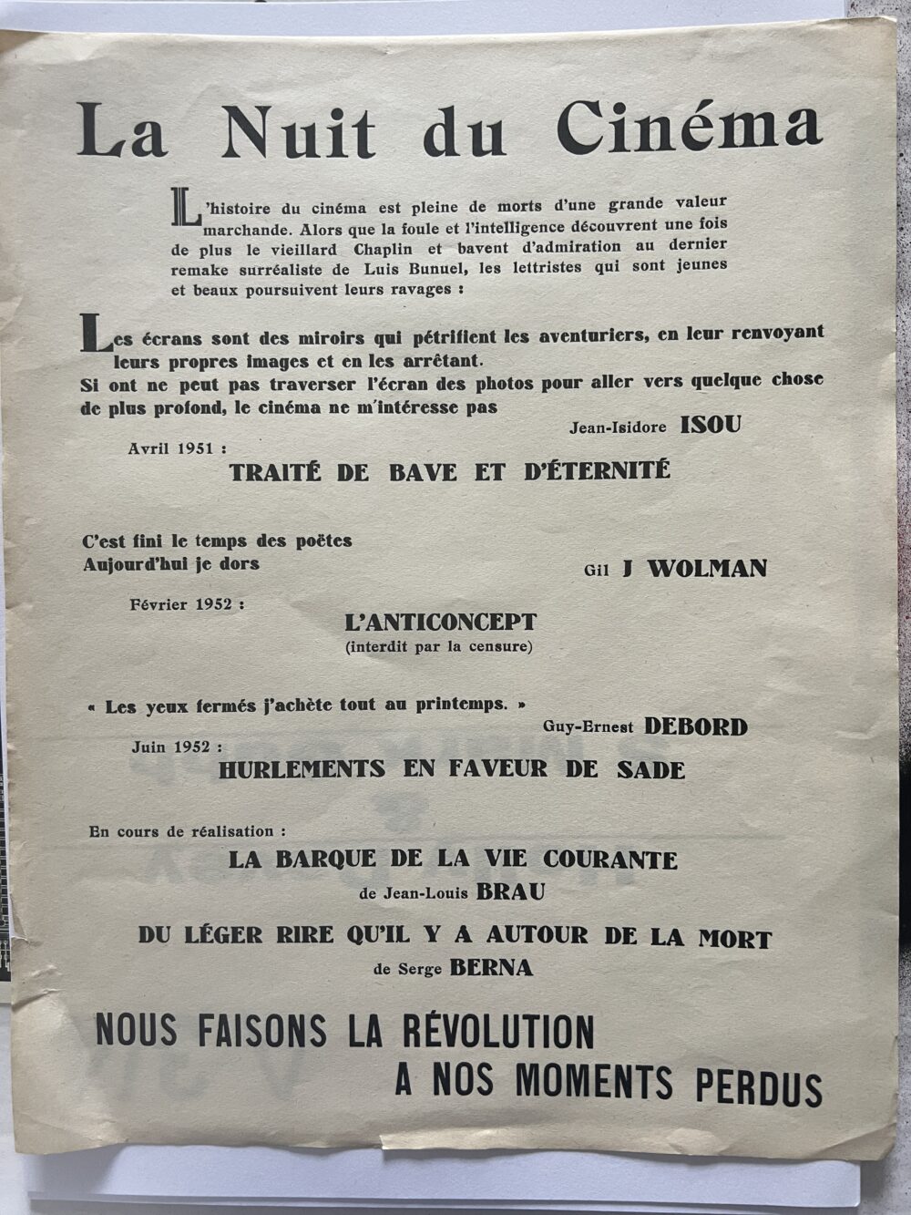 27.5 x 21.5cm 1pp b/w offset announcement for a night of Letteriste cinema which included sou's film "Traité de Bave et d'Eternité" from April 1951; Gil Wolman's "L'Anticoncept" (1952), Guy Debord's "Hurlements en faveur de Sade" from June 1952, Jean Louis Brau's "La barque de la vie courante" and Serge Berna's "Du léger rire qu'il y a autour de la mort" although the last two were still in production.