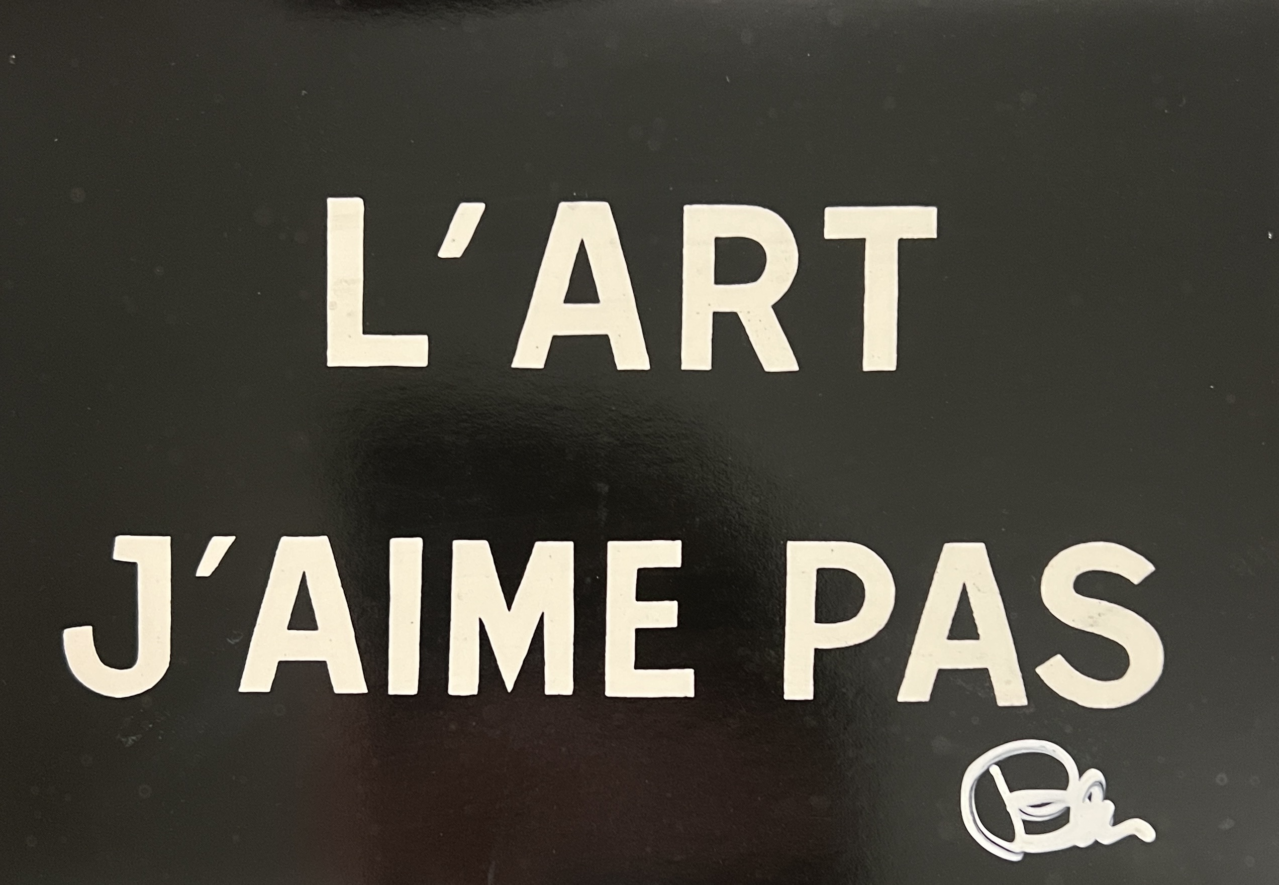 10.5 x 15cm, 2pp artist’s postcard issued by the museum as an edition (limitation unknown). The front of the card reads: “L’ART J’AIME PAS”. This card is signed in white paint bottom right by Ben. VG+. Scarce early work.