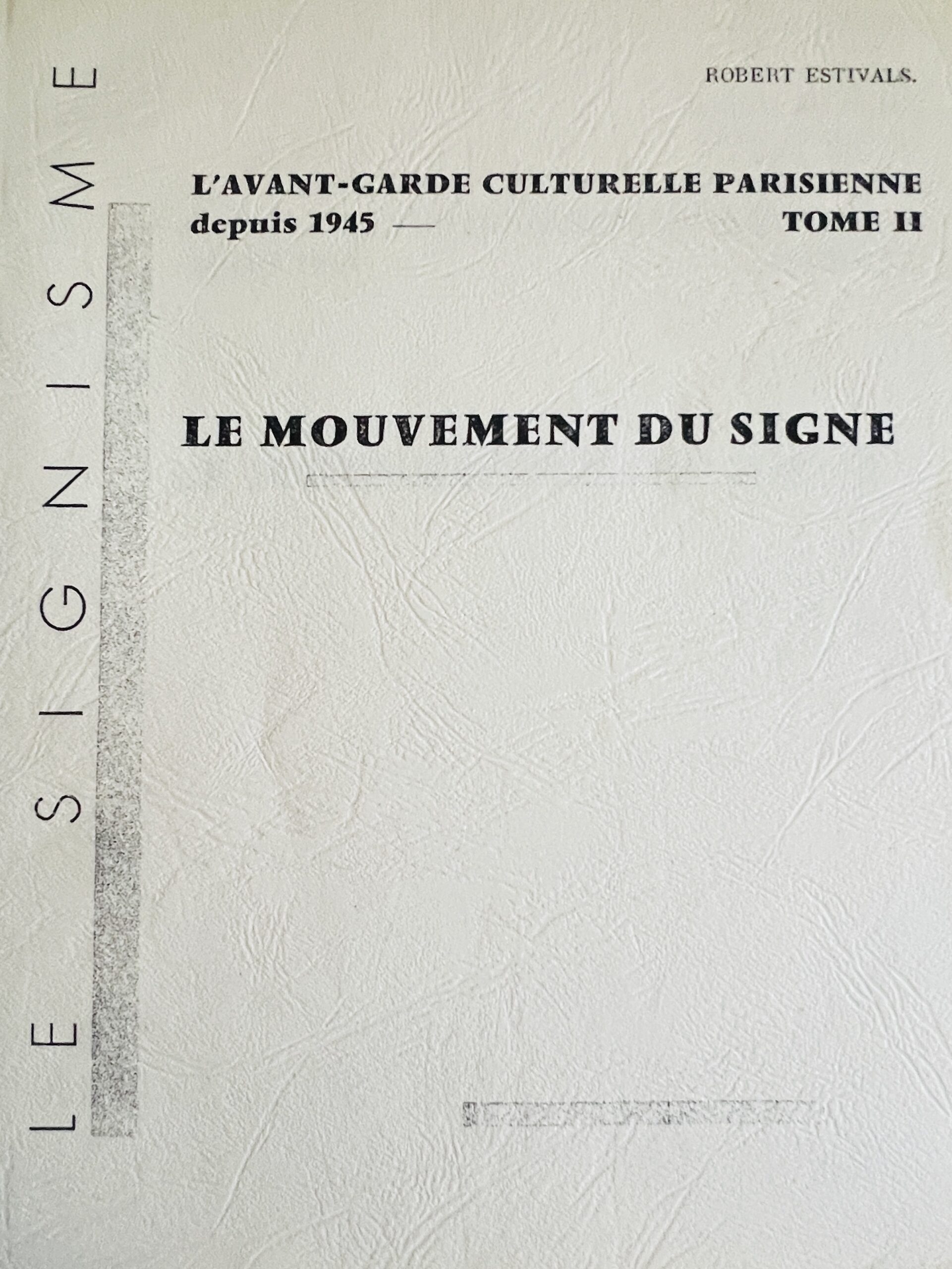 26.5 x 20cm, unoaginated (c. 72pp) all printed recto only. Internally a facsimile reprint of Estival’s original 1963 treatise of the theory of Signisme and explaining Lettrisme, Ultra Lettrisme, the Situationist International and Schematism in terms of symbolism and seminology. Limitation not known but probably not large as this was a personal project. VG+.