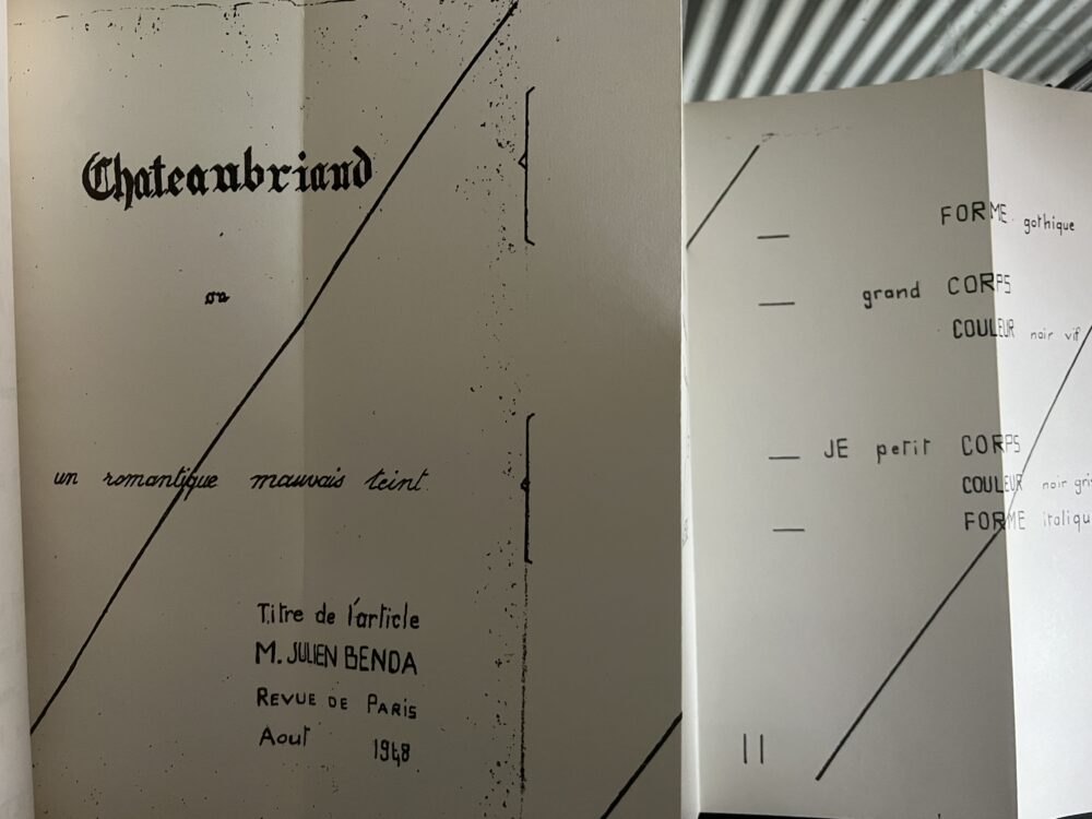 52pp plus unprinted card covers. Perfect bound. One fold out diagram in the artist’s own facsimile hand relating to Julien Benda and Chateaubriand, other pages are also reproduced in such a manner First edition of this theoretical treatise on art and literature issued by the artist and writer at the point where he left the Lettriste movement and founded Ultra-Letterism along with Villegle and Dufrene. This was one of his earliest books. Minor browning else VG+.
