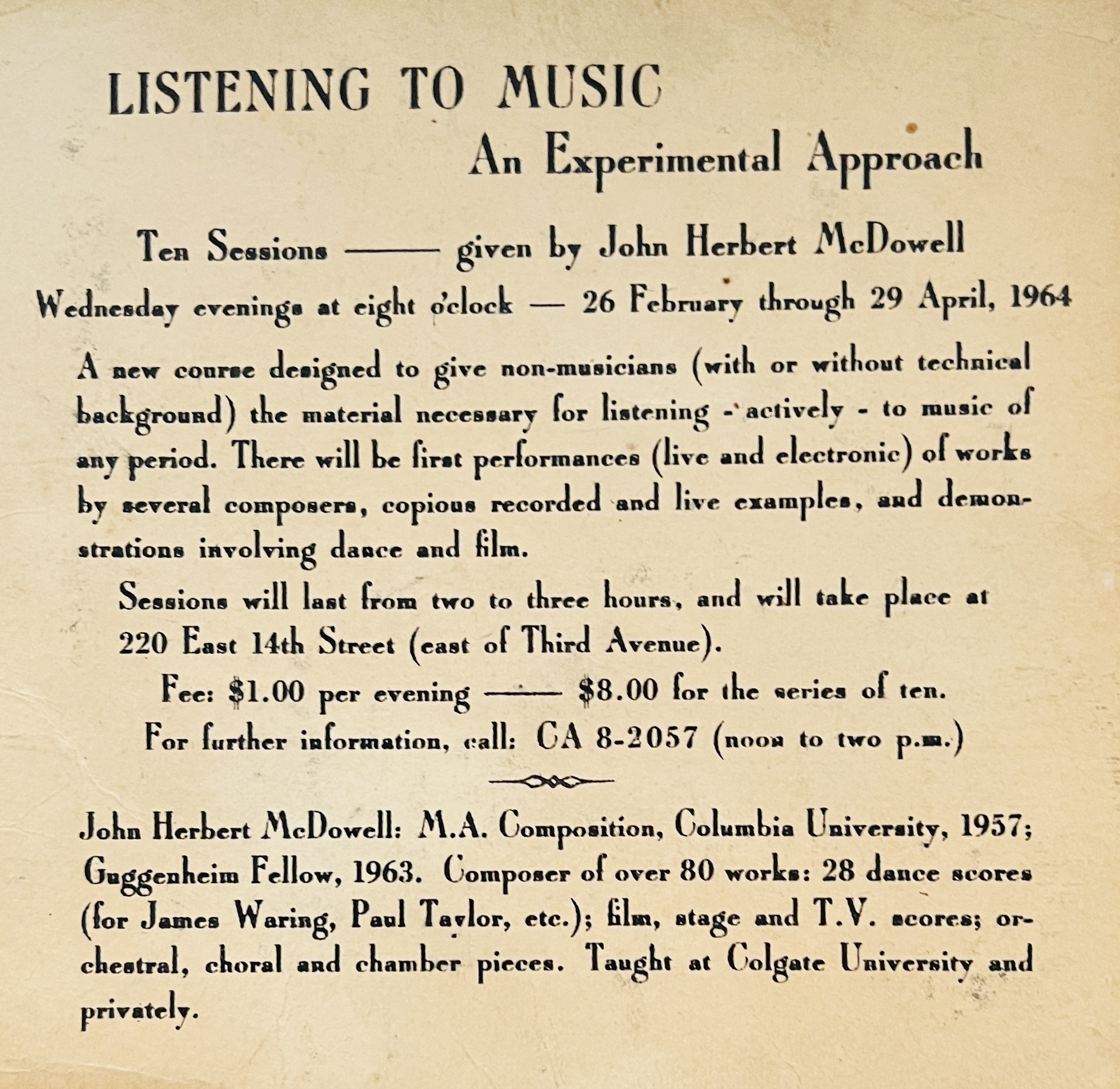 11.6 x 11.7cm, 1pp letterpress promotional leaflet for a course of one to one one-hour seminars with the writer, composer and theorist McDowell to learn how to listen to experimental music (live and electronic).