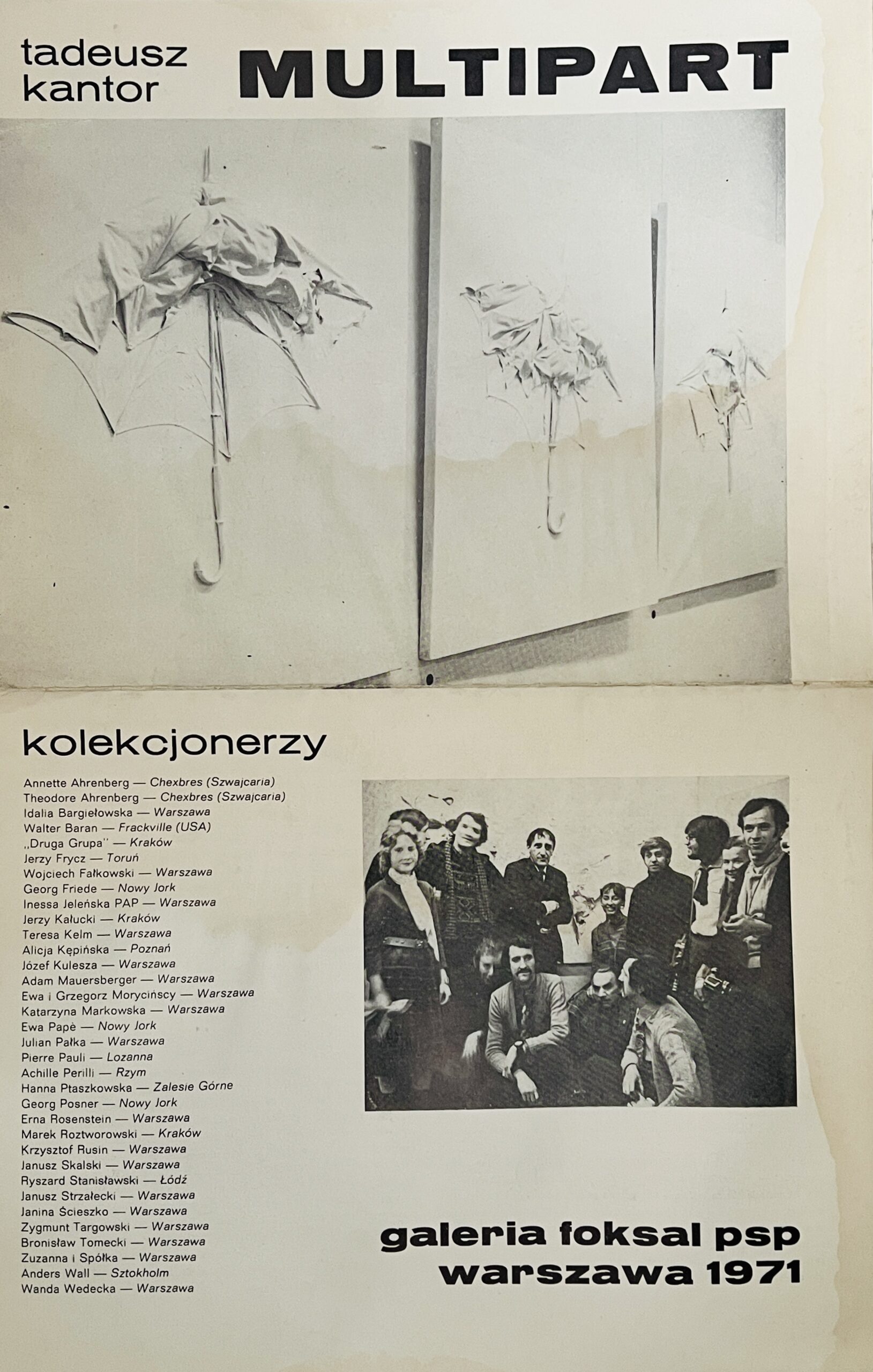 53 x 42cm, 4pp broadside – exhibition catalogue for a show of Kantor’s paintings and sculptures related to his dramaturgical  activities. Ten small b/w images of works  and the cast,  A long text by Wieslaw Borowski in Polish and French.  Long list of exhibitions and performances on last page. Some water stains to the pages (mild browning) else VG. Scarce.