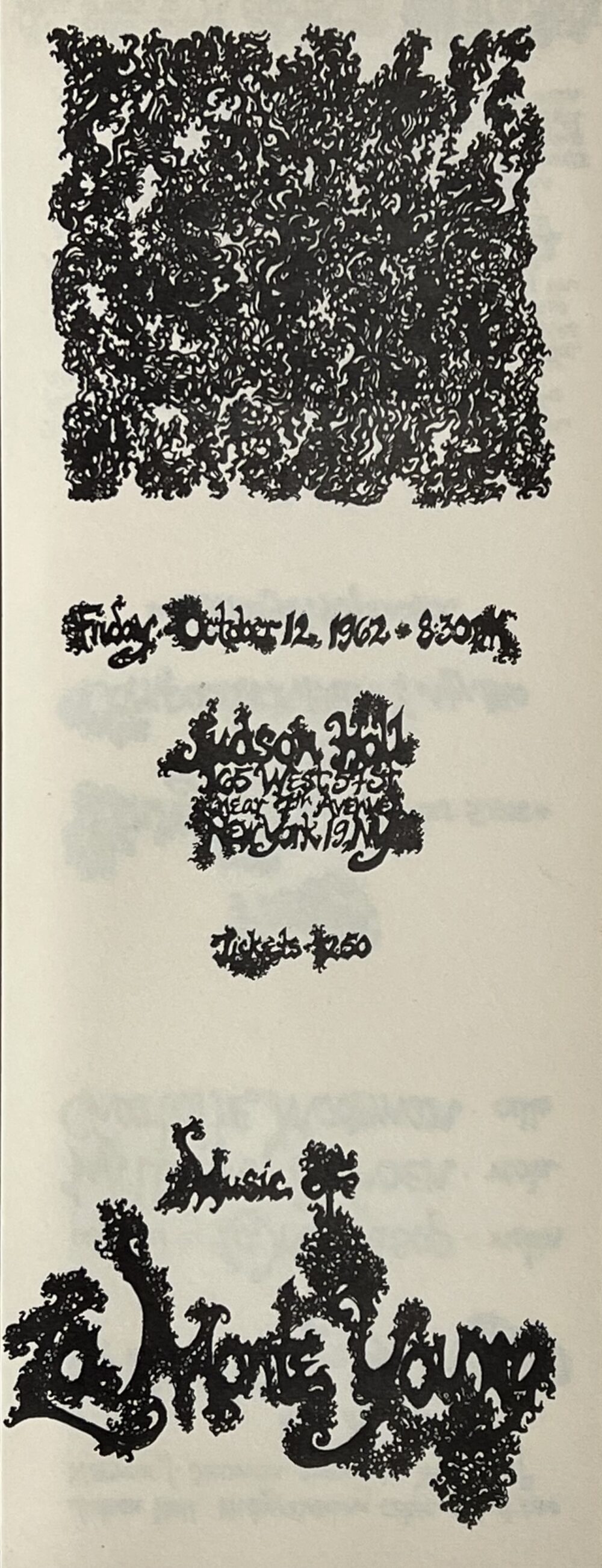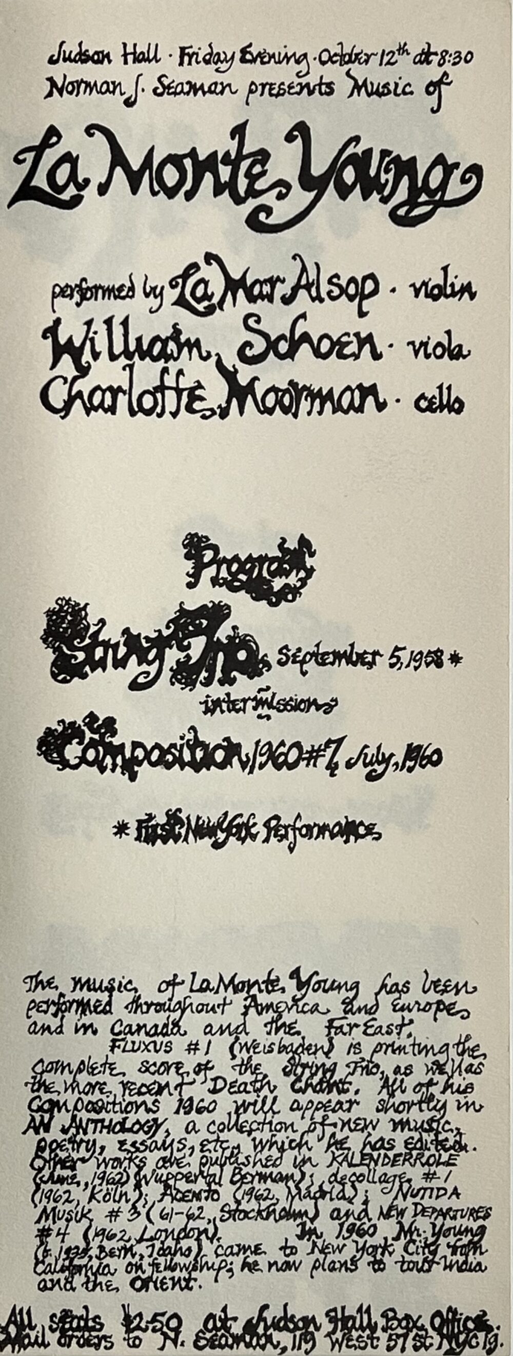 28 x 10cm, 2pp black on light cream programme for this Fluxus concert announcing the “music of La Monte Young” at Judson Hall, N.Y. Friday October 12, 1962 – 8.30 p.m. and decorated with a reproduced drawing and a list of performers: namely, La Mar Alsop, Wm. Schoen, C. Mooreman. Program consisted of String Trio and composition #7 from 1960. (the first N.Y. performances). Additionally this announces publications to come: ie Fluxus #1, An Anthology, Kalenderrolle, Decollage nr 1, etc. An exceptionally rare Fluxus document. The entire leaflet was designed by Zazeela and reproduces a particularly florid example of her graphic skills. Fine. Scarce.