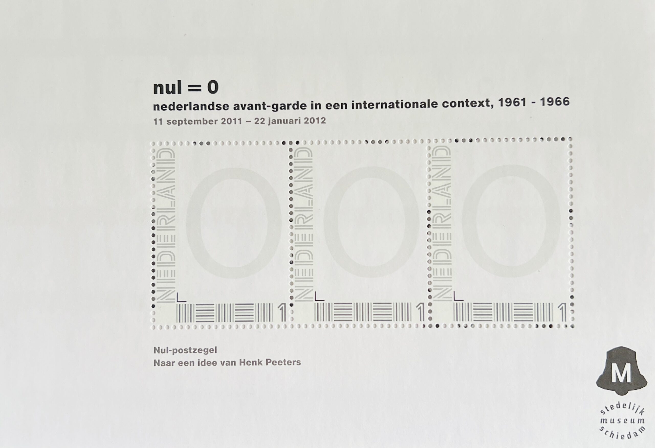 11 x 15.5cm semi-transparent printed envelope content of three 10.5 x 15cm, 2pp artist postcard and a 10.5 x 15cm, 1pp sheet of 3 adhesive cinderella stamps with a “Nul = O” design.