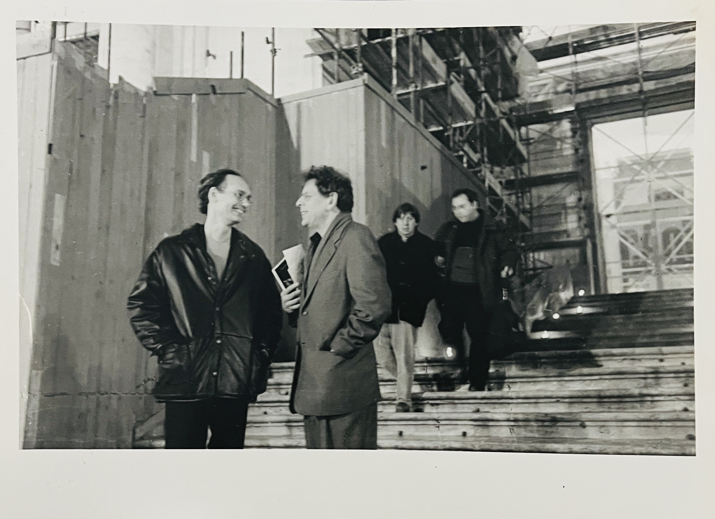 17.8 x 24cm, b/w silver gelatine unique photograph of Philip Glass talking with Michael Harrison. Behind him appears to be Charlemagne Palestine with an unknown man (possibly first name Gianni based on a note on a yellow paper square on then back of the photograph.  This seems to be after the 4 Pianoforti exhibition and individual concerts (Terry Riley being missing from the photograph).  Possibly unique. VG+.
