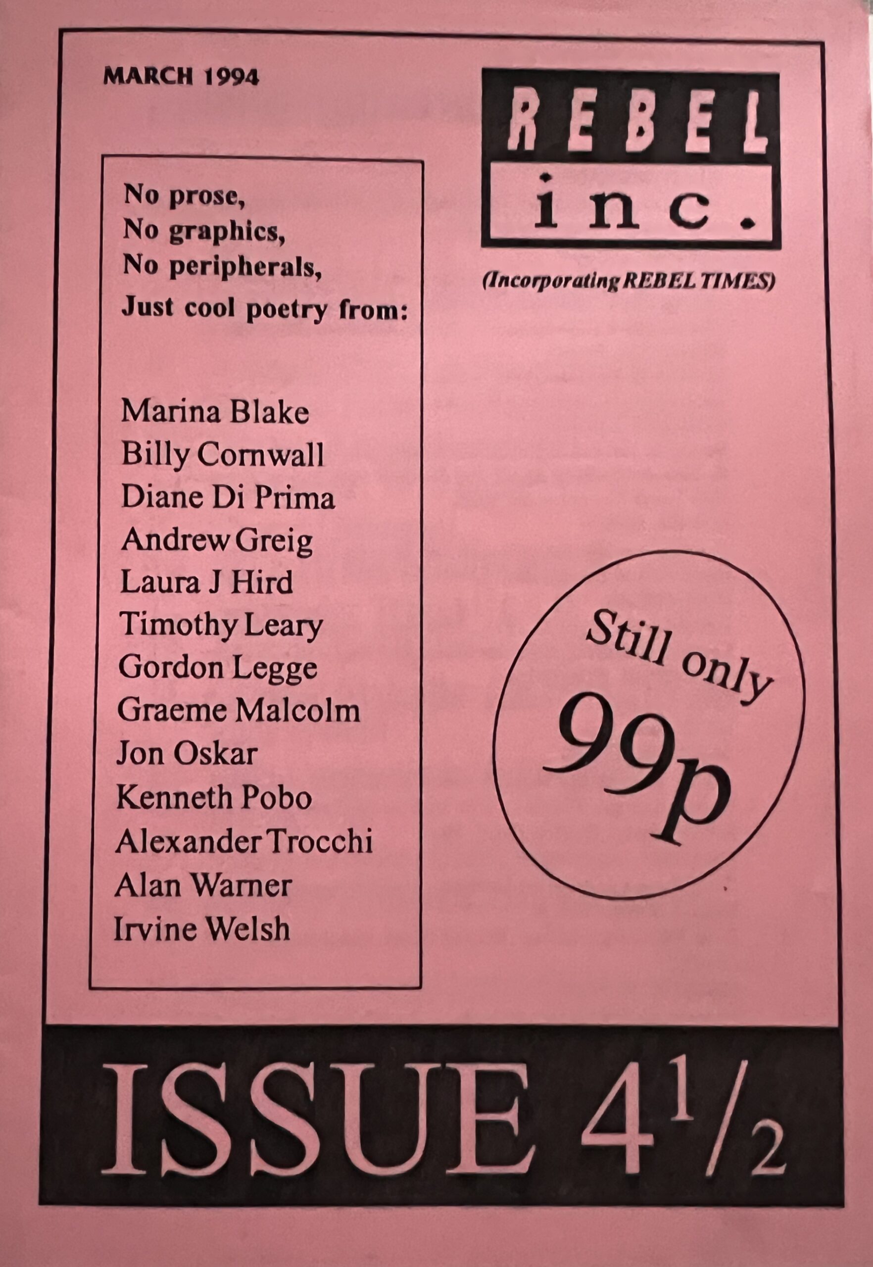 21 x 15cm, 20pp. Pink self wrappers. A single number of this influential politics and culture magazine which was founded by Kevin Williamson (with the support of Irvine Welsh and others). Poetry by Marina Blake, Billy Cornwall, Diane Di Prima, Andrew Greig, Laura J Hird, Timothy Leary, Gordon Legge, Graeme Malcolm, Jon Oskar, Kenneth Pobo, Alexander Trocchi, Alan Warner and Irvine Welsh. VG+.