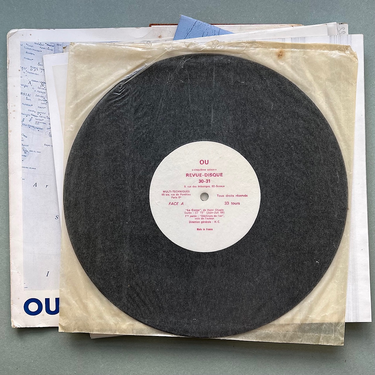 26 x 26cm outer cover printed in blue on white designed by Ben Vautier. 10 inch record with paper artworks. A single number of Chopin’s long running assemblage and musical publication.