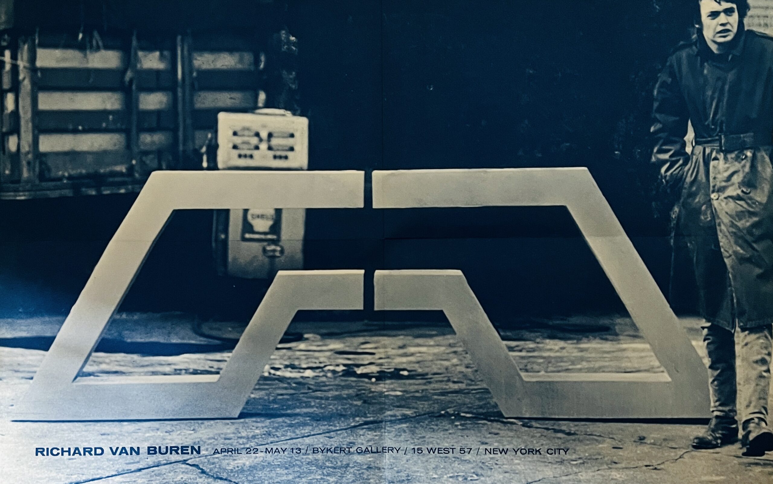 34.4 x 53.4 blue on white exhibition poster with an image of the artist outside with a minimalist sculture. A franked and mailed copy with gallery details on the other side, typed address. A VG+ example of a very scarce early poster for one of the artist’s earliest shows (possibly his first solo show). Slight browning from sunning on the mostly blank, mailing side.