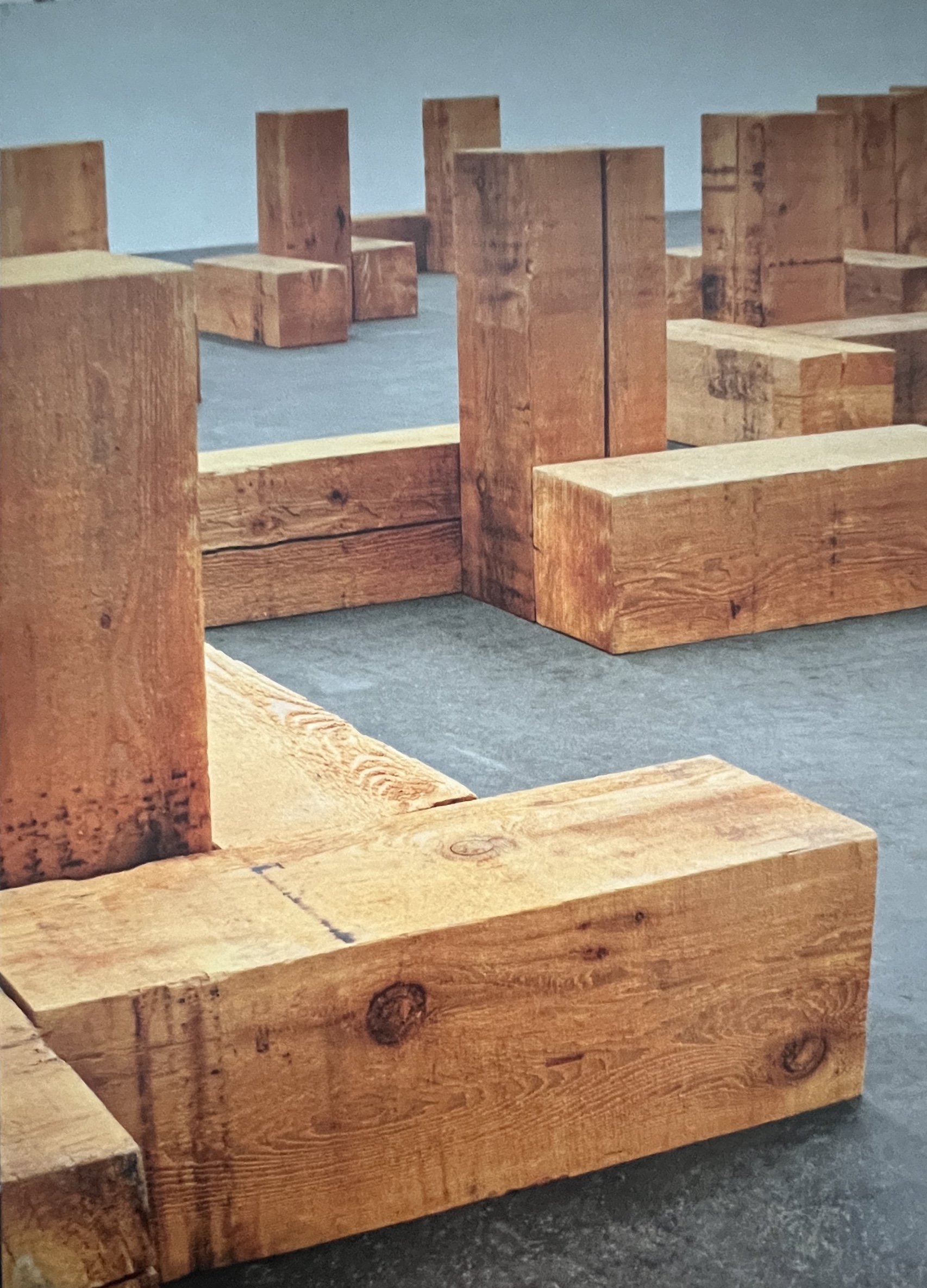 21 x 15cm, 2pp announcement card for a museum show of new and old sculptures by Andre. Front of card has a colour image of Uncarved Blocks from 1975, verso museum details. VG+.
