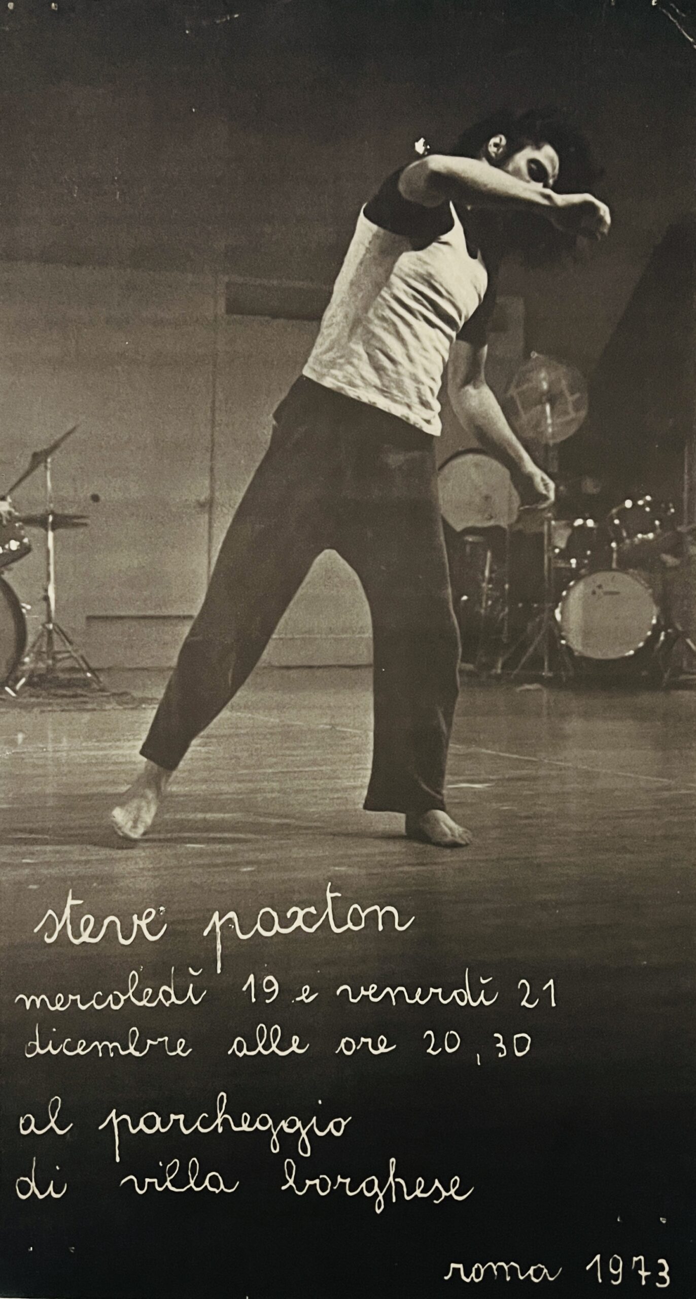 33.5 x 19cm, b/w offset lithographic poster on thick paper for a solo dance event by the influential Paxton who invented the dance style called “contact improvisation”. The performance took place at the famous L’Attico art gallery in its original location. Paxton was a founding member of the Judson Dance Theater and trained with Merce Cunningham and later collaborated with Yvonne Rainer and Trisha Brown. VG+ condition. Scarce.