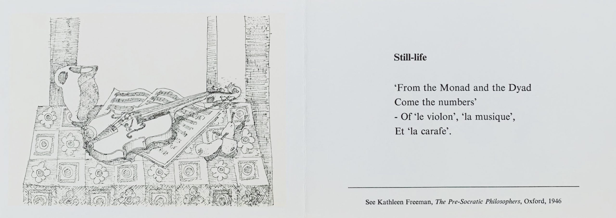 The poem cites a pre-Socratic saying meaning that number is an emerging-property of units and elements. Those elements in a still life are a violin, music and a jug which are common in most period still-lives.