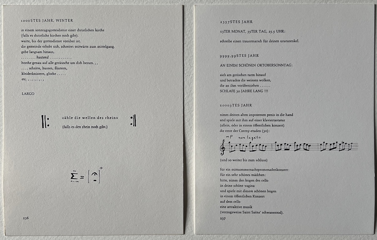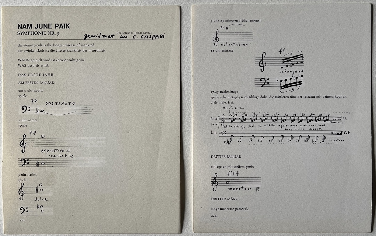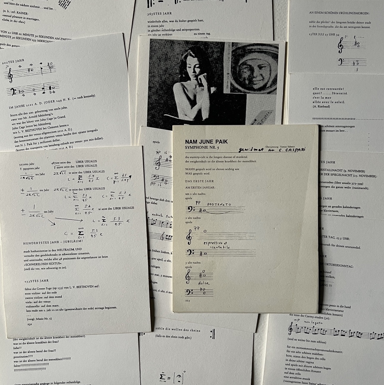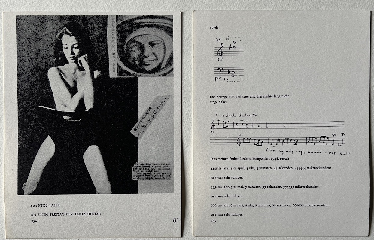 13 x 10cm, 18 single pages each printed recto. An expanded (after the original first edition which was a typescript ) artist’s book by Paik with various reproduced collaged elements and scores. Many of the original hand-written amendments to the first publication are retained in facsimile. This was also printed in the Vostell “Happening” book from Rohwolt Verlag and is really a stand alone offprint. VG+ in original glassine envelope (good ++). Very scarce.