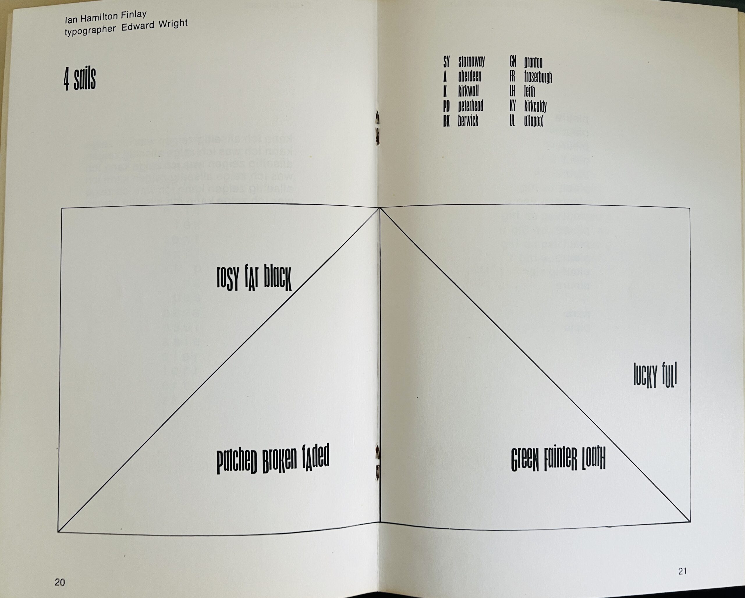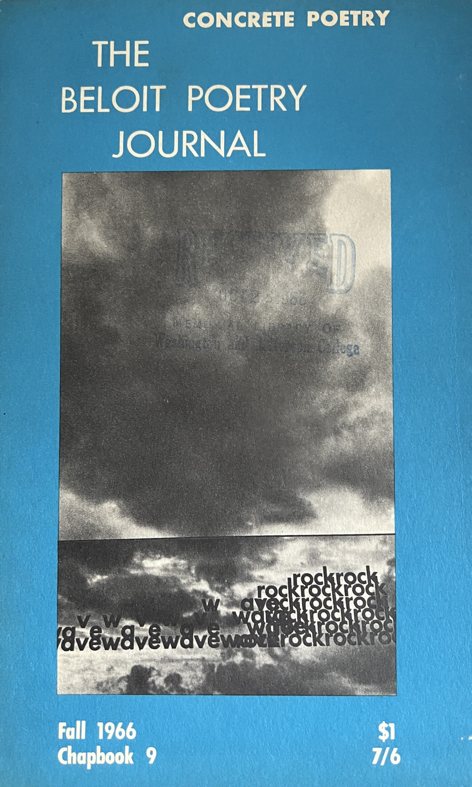 Wisconsin: The Beloit Poetry Journal, 1966 21 x 14cm, 40pp plus pictorial wrappers. Single number of this long running Chapbook which here dedicates itself to the concrete poets. Works by all the leading figures including Gomringer, de Campos, dsh, Gerhard Ruhm, Pierre Garnier, Edwin Morgan and Robert Lax amongst others are joined by Finlay – who has three page works including a schematic redrawing of his 4 Sails standing poems which as far as we know is not reproduced elsewhere. The cover is also a glass work by Finlay – Rock Wave. VG+.