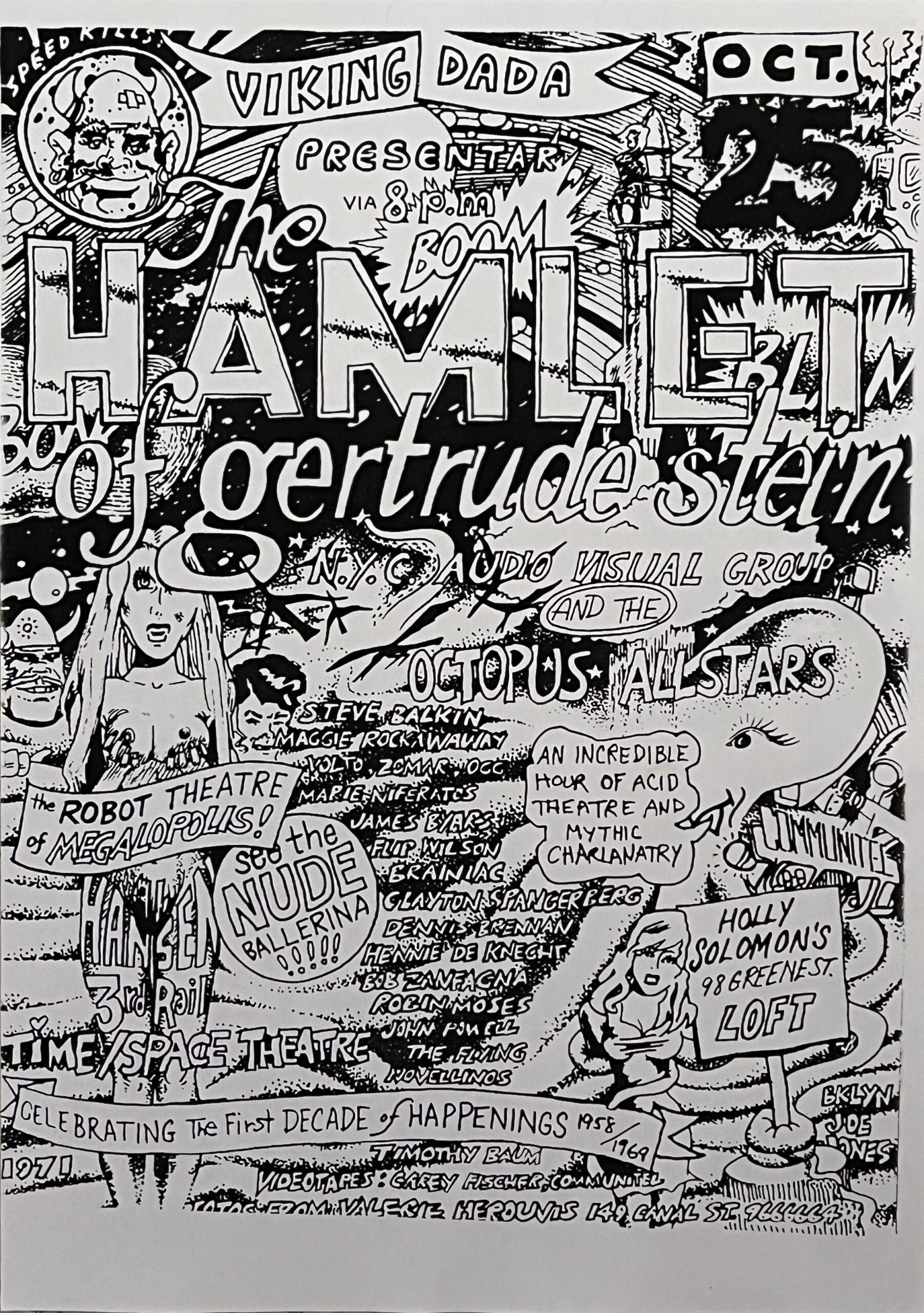 30 x 21cm, original vintage xerox (as issued) with an extensive Hansen design for an happening which included the NYC Audio Visual Group and the Octopus Allstars as well as the Robot Theatre of Megalopolis. VG+.