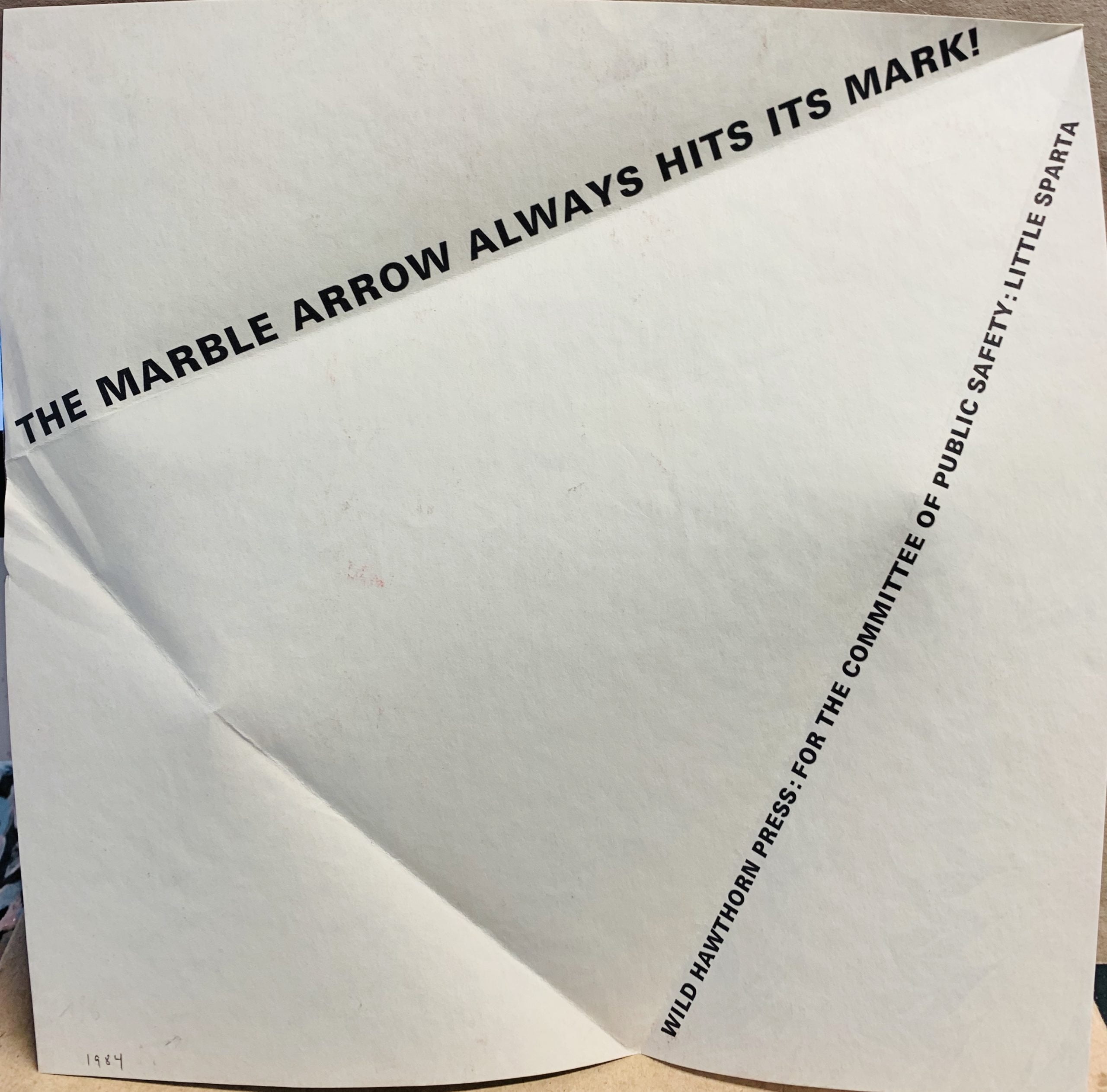 The inner message is “THE MARBLE ARROW ALWAYS HITS ITS MARK!”. Finlay has made this into a paper dart which is a weapon of sorts in the Little Spartan Wars. There is a some very faint transparent line on the printed side (clearly a printer’s mistake) biut else VG+.