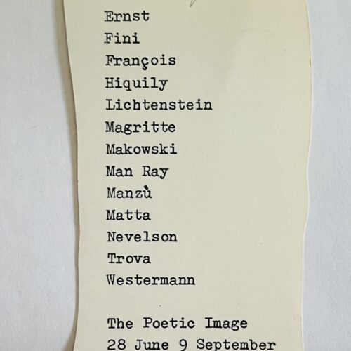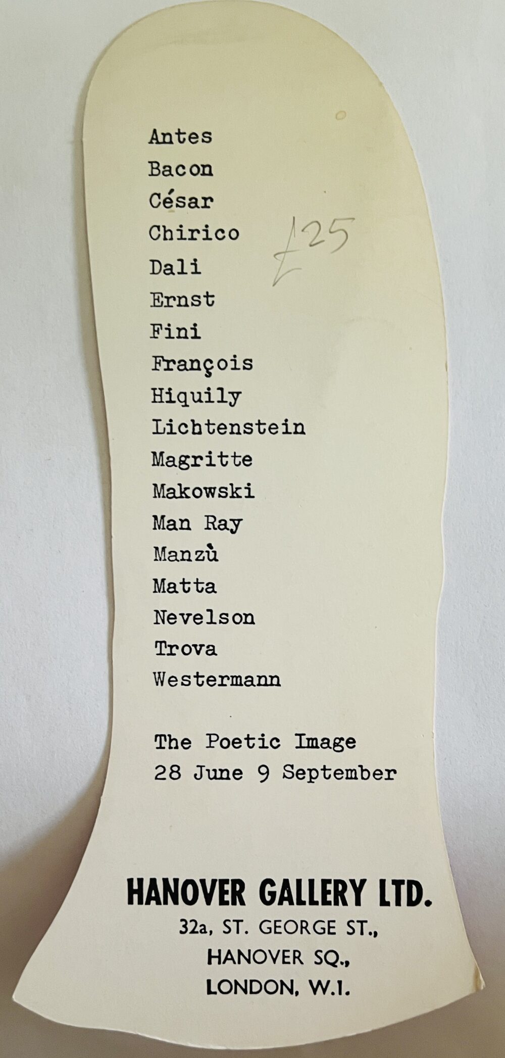 22 x 6cm (approx) die-cut announcement card with a thumb on the front and a list of the participating artists on the back including Horst Antes, Francis Bacon, Cesar, Giorgio de Chirico, Salvador Dali, Max Ernst, Leonor Fini, Hiquily, Roy Lichtenstein, Rene Magritte, Makowski, Man Ray, Giacomo Manzu, Louise Nevelson, Trova, H.C. Westermann. VG+. Scarce.