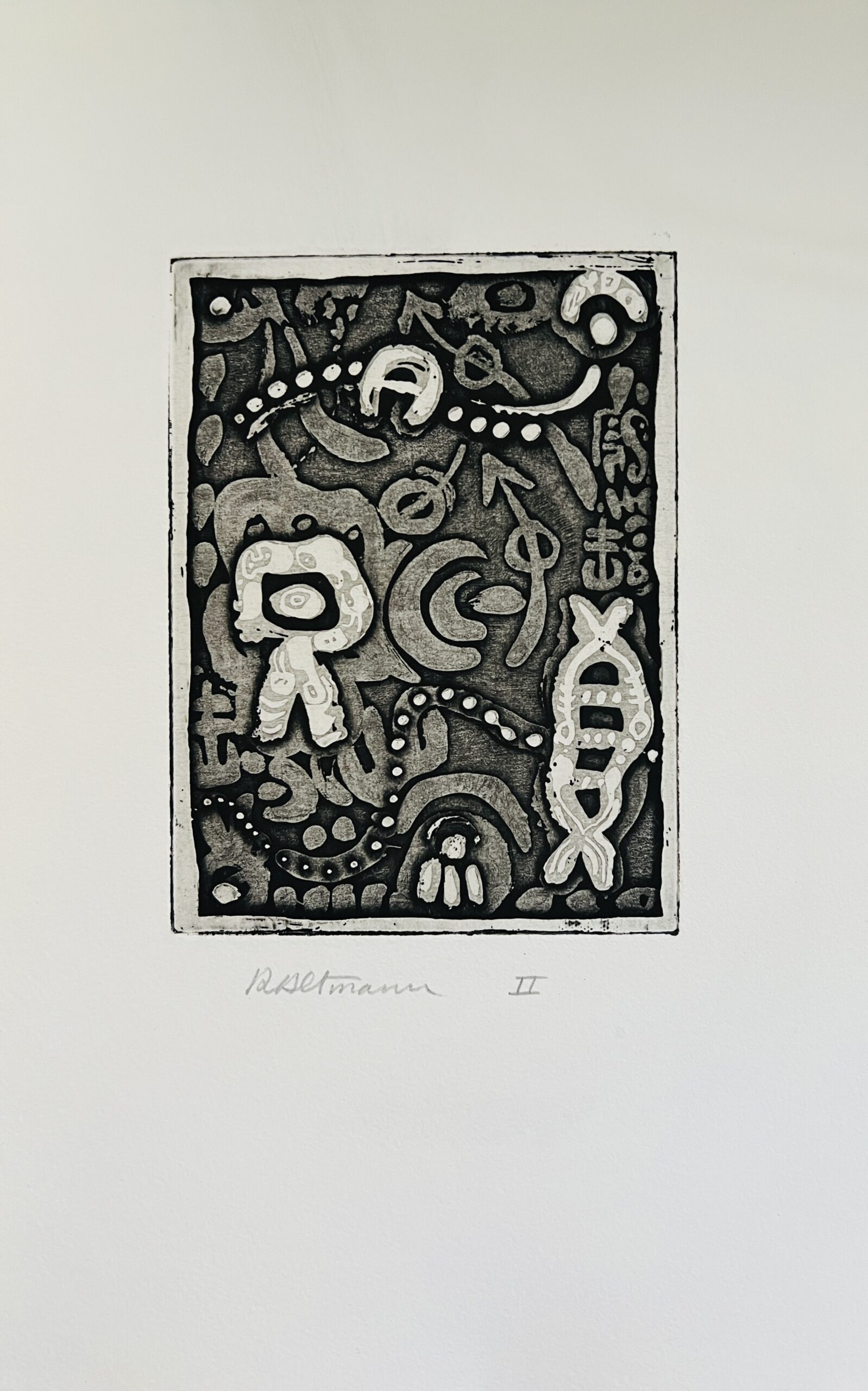 25.1 x 16.3cm, black on white etching (image size 12 x 8.6cm) which was found in the deluxe edition of Isadore Isou’s “Les Champs de Force de la Peinture Lettriste”. This is signed below the image in pencil and numbered “II” by the artist. VG+.