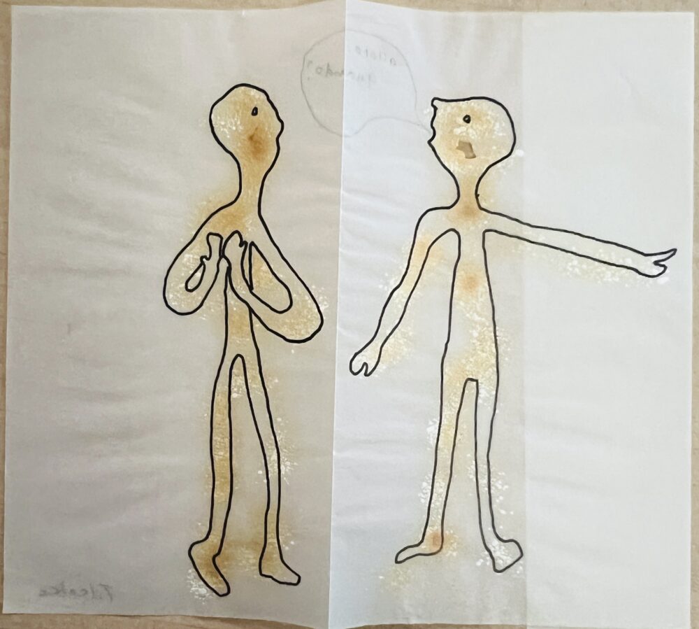 14.7 x 20.8cm (approx.) hand cut transparent paper which the artist has an original small drawwing in black ink and brown paint of teo genderless figures. There is a deliberate hole in one of the figures and a speech bubble with text by Saito. Signed by Saito. VG+ but deliberately folded into three sections by the artist.