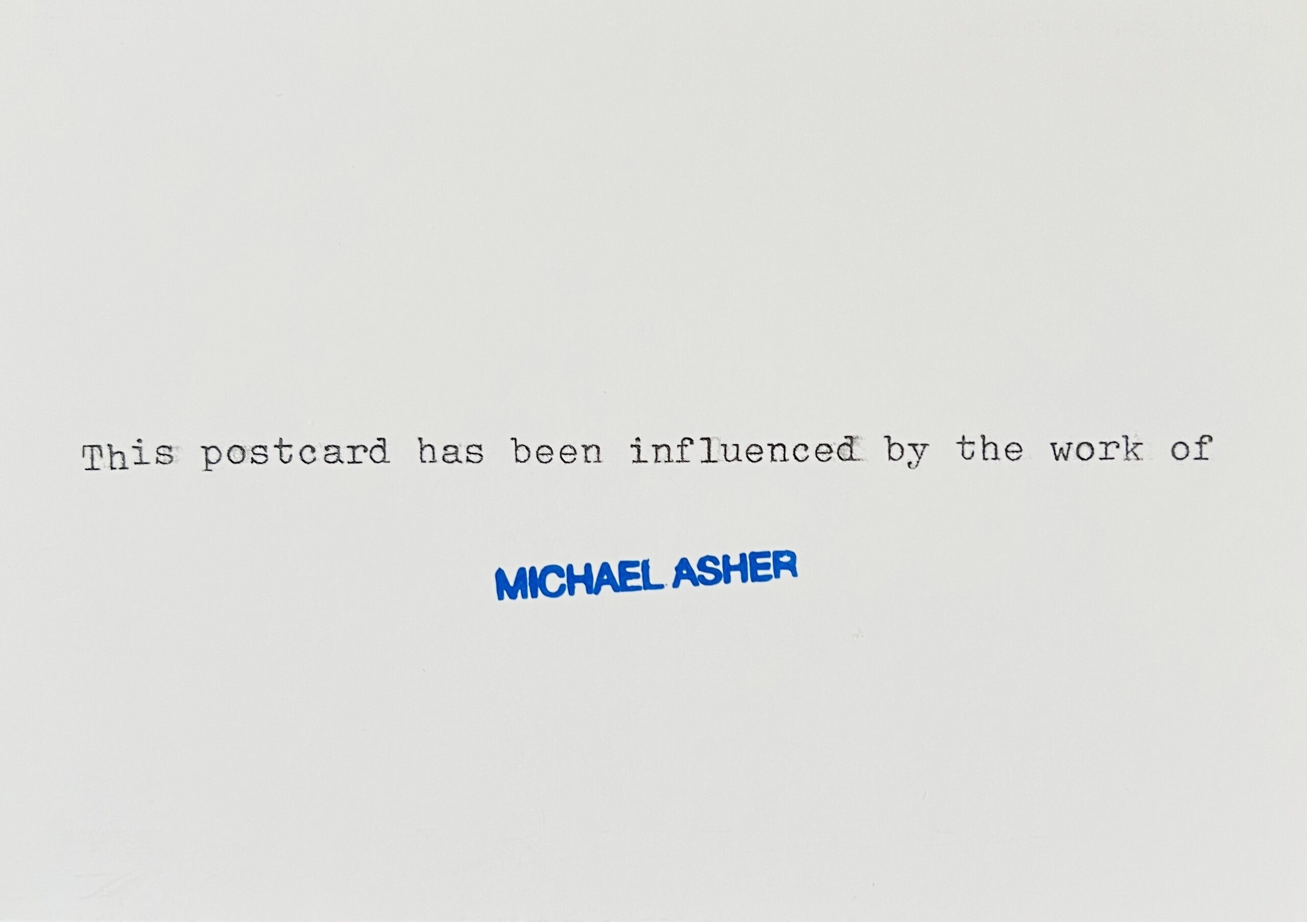 10.5 x 15cm, 2pp hand made artist’s postcard issued as part of the “Postal Service Series” – each card by Monk having a different artist’s name rubber stamped underneath the offset printed text: “This postcard has been influenced by the work of”. Here: MICHAEL ASHER the conceptual artist. The card is signed in full by Monk in pencil on the back. A unique (within a series) mail art work. Similar works by Monk were issued originally in 2003. VG+.