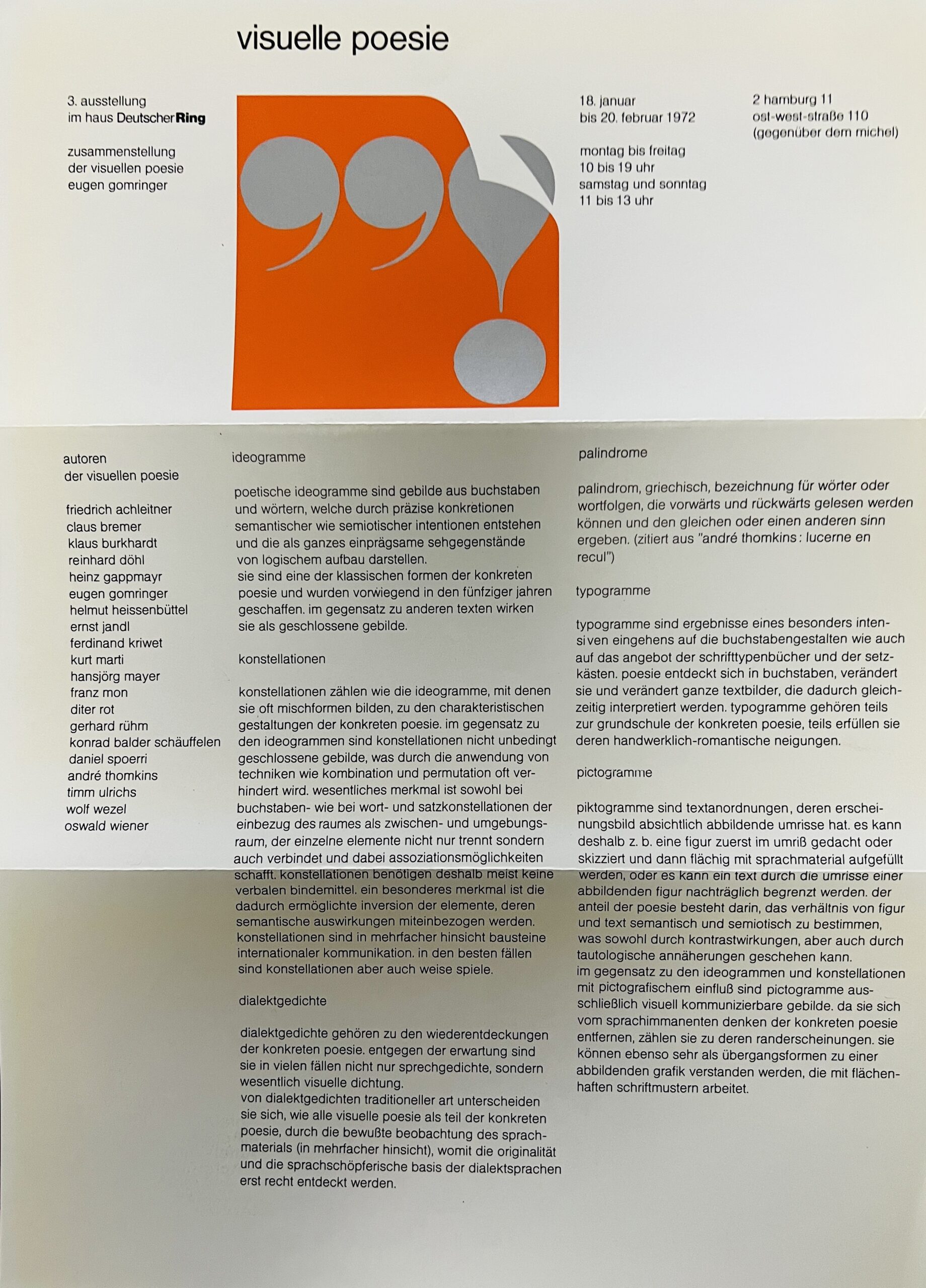 30 x 21cm, 2pp. Announcement leaflet for a significant exhibition of visual poetry which was curated and edited by Eugen Gomringer with 6 reproductions in b/w of works by Eugen Gomringer, Konrad Balder, Timm Ulrichs, Andre Tomkins, Klaus Burkhardt and Reinhard Dohl. Folded as issued. VG+.