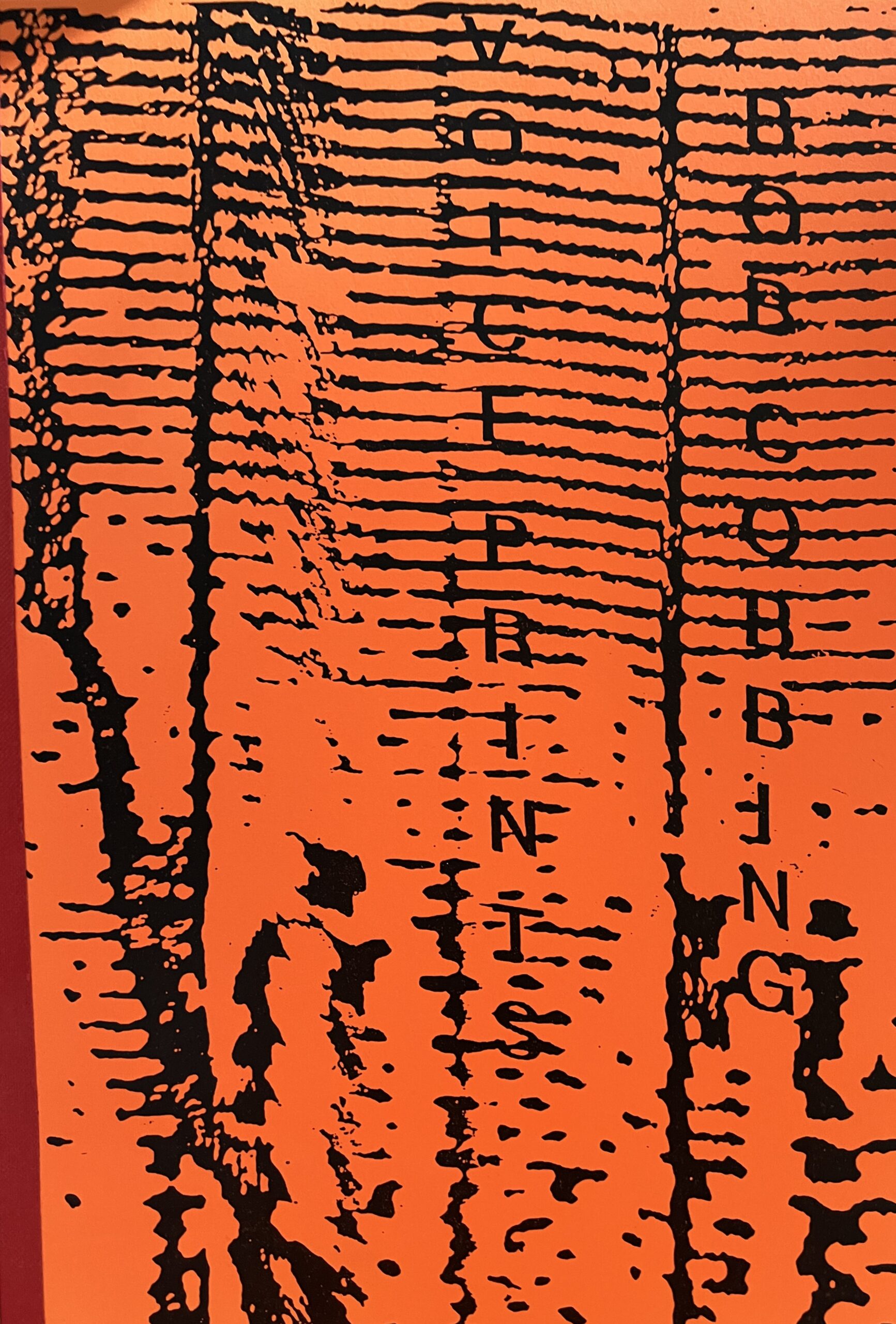30 x 21cm, 94 plus card covers. Stapled with ribbon covering. An artist’s book with reproductions of the output of Cobbing’s voice reading works that have been processed by a computer and reproduced further by photocopies. Foreword by the poet. VG+. Scarce.